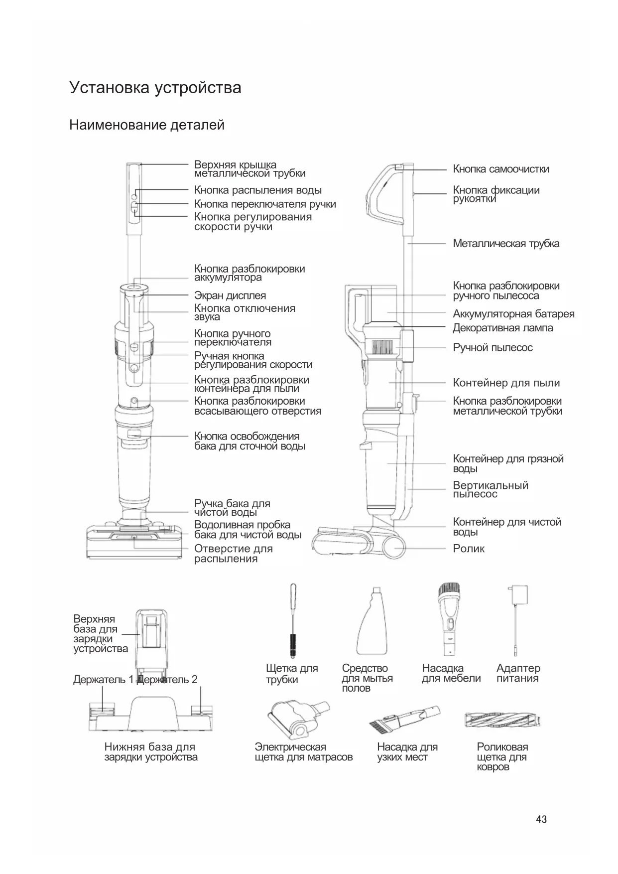 Бесщеточный двигательГромкого-ворительПанель экрана дисплеяКнопка отключения звукаКнопка фиксации рукояткиКнопка самоочисткиКонтейнер грязной водыДвигатель жесткой щетки
