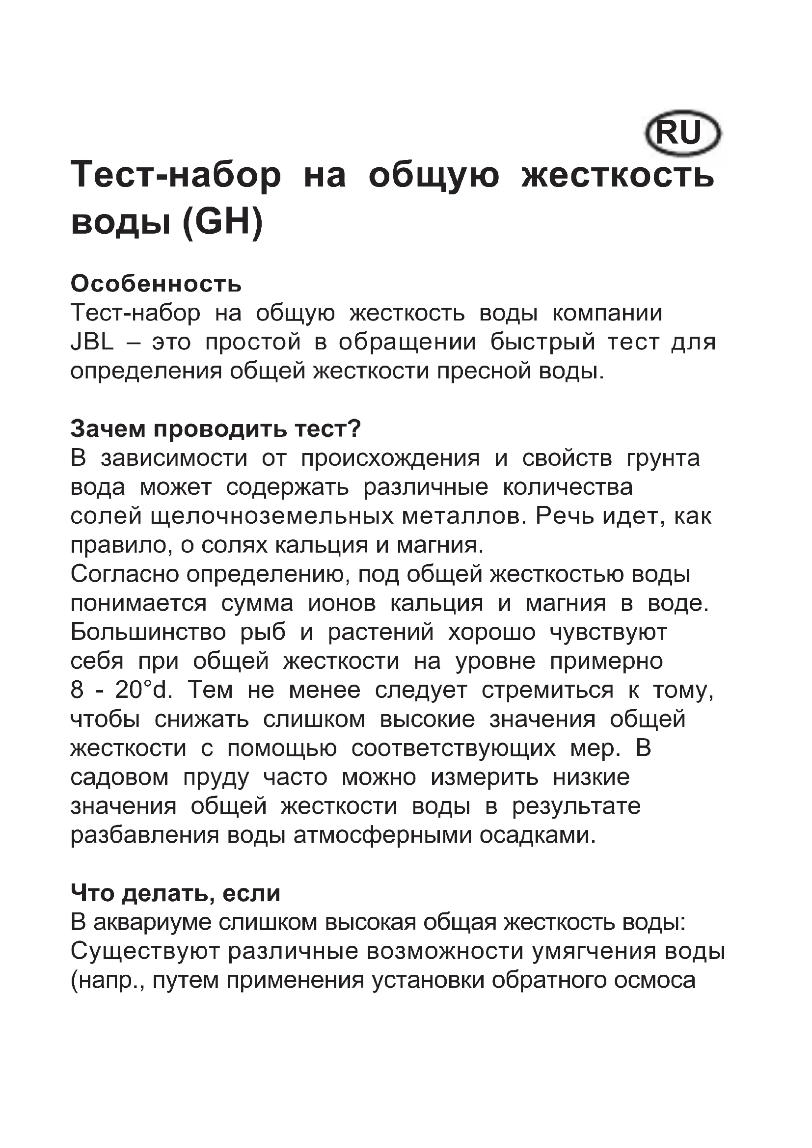 0,01 0,020 0,056 - 0,0702 0,10 Stopień angielski °e 0,14 0,285 0,798 14,30 - 1,43 Stopień francuski °f 0,10 0,200 0,560 10,00 0,702 -RU Тест-набор на общую жесткость воды (GH) Особенность Тест-набор на общую жесткость воды компании JBL – это простой в обращении быстрый тест для определения общей жесткости пресной воды. Зачем проводить тест? В зависимости от происхождения и свойств грунта вода может содержать различные количества солей щелочноземельных металлов. Речь идет, как правило, о солях кальция и магния. Согласно определению, под общей жесткостью воды понимается сумма ионов кальция и магния в воде. Большинство рыб и растений хорошо чувствуют себя при общей жесткости на уровне примерно