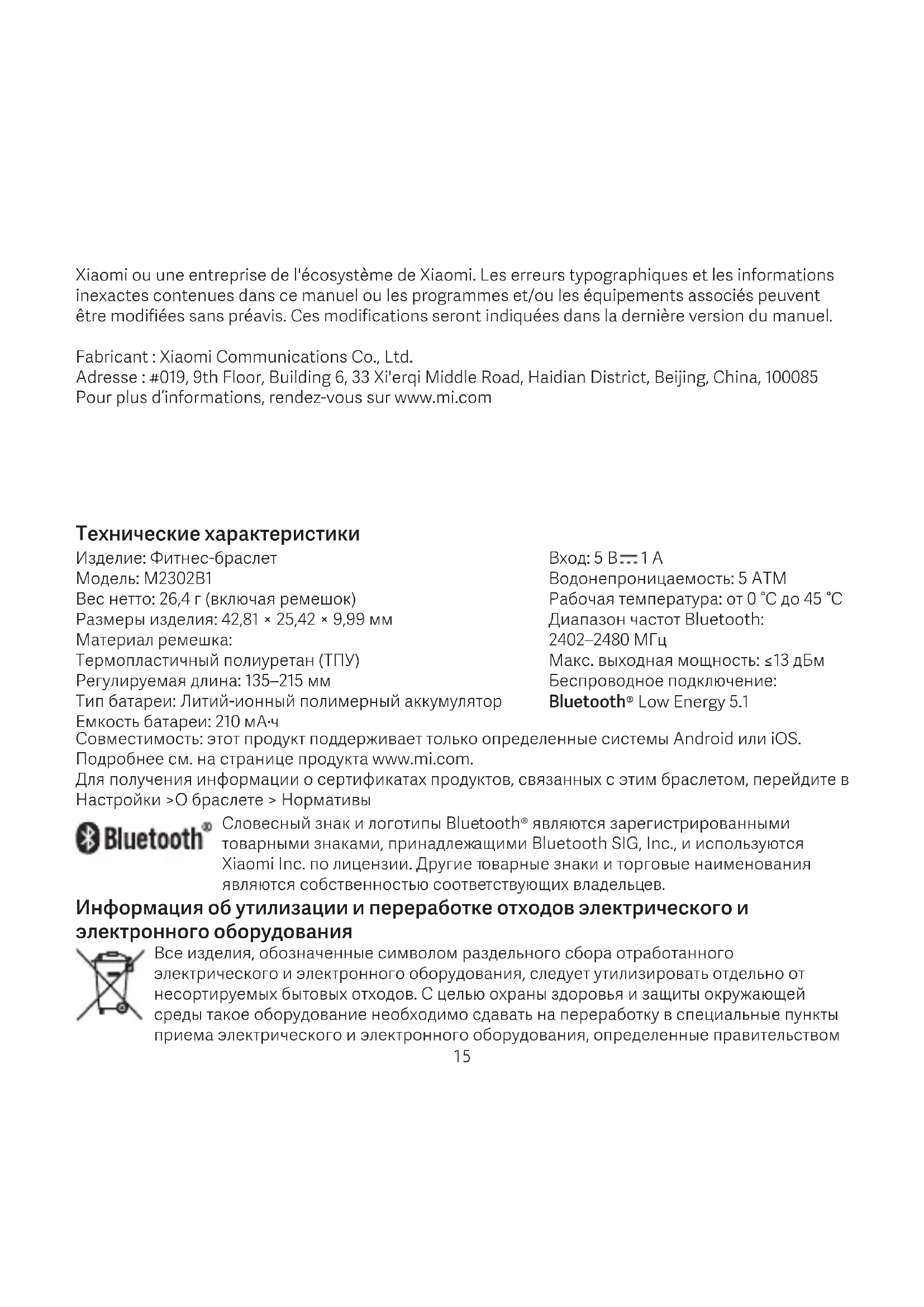 Avis de non-responsabilité: Les illustrations du produit, des accessoires, des interfaces utilisateur et d'autres éléments de ce manuel d'utilisation sont des schémas de principe à titre indicatif uniquement et peuvent être légèrement différentes du produit réel. Ce manuel est publié par 14Xiaomi ou une entreprise de l'écosystème de Xiaomi. Les erreurs typographiques et les informations inexactes contenues dans ce manuel ou les programmes et/ou les équipements associés peuvent être modifiées sans préavis. Ces modifications seront indiquées dans la dernière version du manuel. Fabricant: Xiaomi Communications Co., Ltd. Adresse: #019, 9th Floor, Building 6, 33 Xi'erqi Middle Road, Haidian District, Beijing, China, 100085 Pour plus d’informations, rendez-vous sur www.mi.com Технические характеристики Изделие: Фитнес-браслет Модель: M2302B1 Вес нетто: 26,4 г (включая ремешок) Размеры изделия: 42,81×25,42×9,99мм Материал ремешка: Термопластичный полиуретан (ТПУ) Регулируемая длина: 135–215 мм Тип батареи: Литий-ионный полимерный аккумулятор Емкость батареи: 210мА·ч Вход: 5 В 1 А Водонепроницаемость: 5 ATM Рабочая температура: от 0°C до 45°C Диапазон частот Bluetooth: 2402–2480 МГц Макс. выходная мощность: ≤13 дБм Беспроводное подключение: Bluetooth® Low Energy 5.1 Совместимость: этот продукт поддерживает только определенные системы Android или iOS. Подробнее см. на странице продукта www.mi.com. Для получения информации о сертификатах продуктов, связанных с этим браслетом, перейдите в Настройки >О браслете > Нормативы Словесный знак и логотипы Bluetooth® являются зарегистрированными товарными знаками, принадлежащими Bluetooth SIG,Inc., и используются Xiaomi Inc. по лицензии. Другие товарные знаки и торговые наименования являются собственностью соответствующих владельцев. Информация об утилизации и переработке отходов электрического и электронного оборудования Все изделия, обозначенные символом раздельного сбора отработанного электрического и электронного оборудования, следует утилизировать отдельно от несортируемых бытовых отходов. С целью охраны здоровья и защиты окружающей среды такое оборудование необходимо сдавать на переработку в специальные пункты приема электрического и электронного оборудования, определенные правительством 15или местными органами власти. Правильная утилизация и переработка помогут предотвратить возможные негативные последствия для окружающей среды и здоровья человека. Чтобы узнать, где находятся такие пункты сбора и как они работают, обратитесь в компанию, занимающуюся установкой оборудования, или в местные органы власти. Декларация о соответствии нормативным требованиям ЕС Настоящим компания Xiaomi Communications Co., Ltd. заявляет, что тип радиооборудования M2302B1 соответствует требованиям Директивы 2014/53/EU. Полный текст декларации о соответствии нормативным требованиям ЕС доступен по следующему адресу: hp://www.mi.com/global/service/support/declaration.html Правила и условия реализации: без ограничений. Продукт должен транспортироваться в оригинальной упаковке. Не подвергайте продукт давлению или ударам во время транспортировки. Соответствие техническим регламентам Соответствие техническим регламентам: ТР ТС 020/2011 «Электромагнитная совместимость технических средств» ТР ЕАЭС 037/2016 «Об ограничении применения опасных веществ в изделиях электротехники и радиоэлектроники»