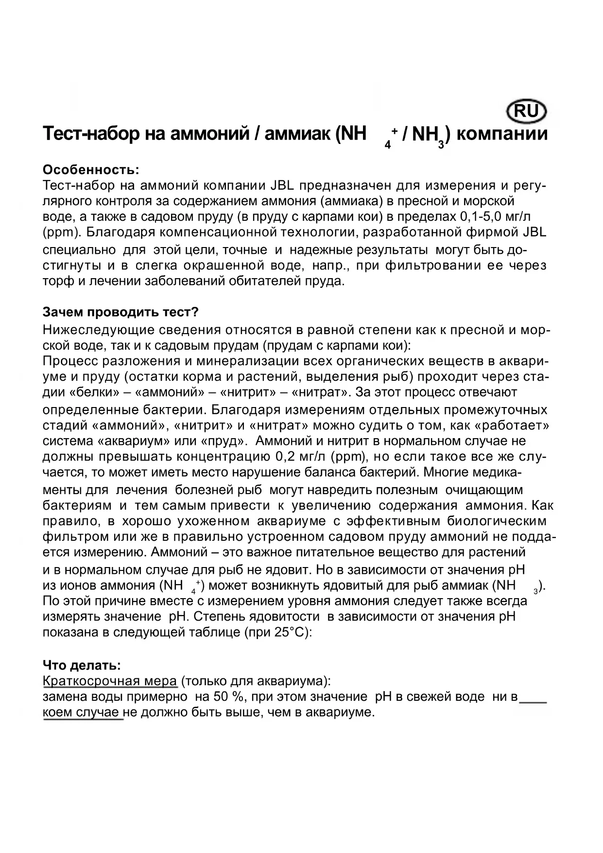 NH4 Test - Водяной фильтр JBL - Бесплатное руководство пользователя