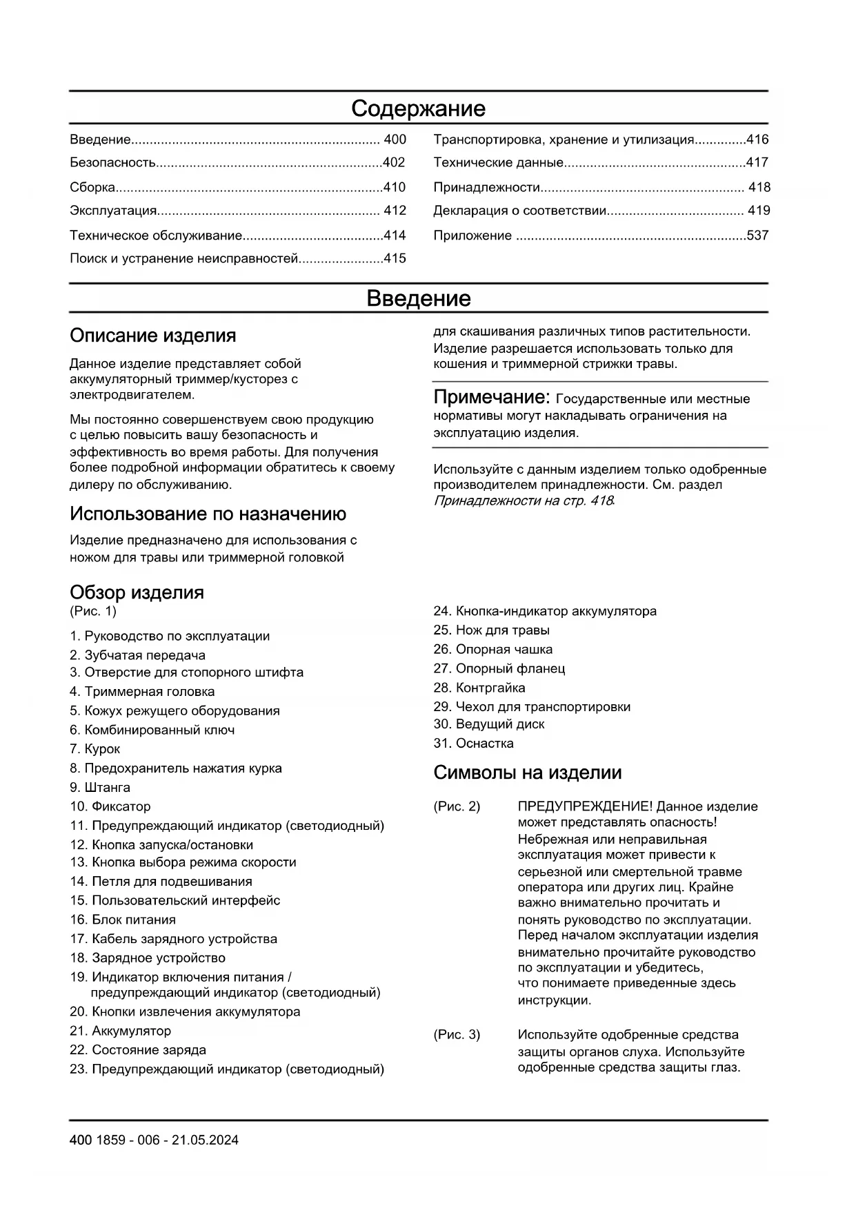 Символы на изделии (Pис. 2) ПРЕДУПРЕЖДЕНИЕ! Данное изделие может представлять опасность! Небрежная или неправильная эксплуатация может привести к серьезной или смертельной травме оператора или других лиц. Крайне важно внимательно прочитать и понять руководство по эксплуатации. Перед началом эксплуатации изделия внимательно прочитайте руководство по эксплуатации и убедитесь, что понимаете приведенные здесь инструкции. (Pис. 3) Используйте одобренные средства защиты органов слуха. Используйте одобренные средства защиты глаз. 400 1859 - 006 - 21.05.2024(Pис. 4) Максимальная скорость / скорость без