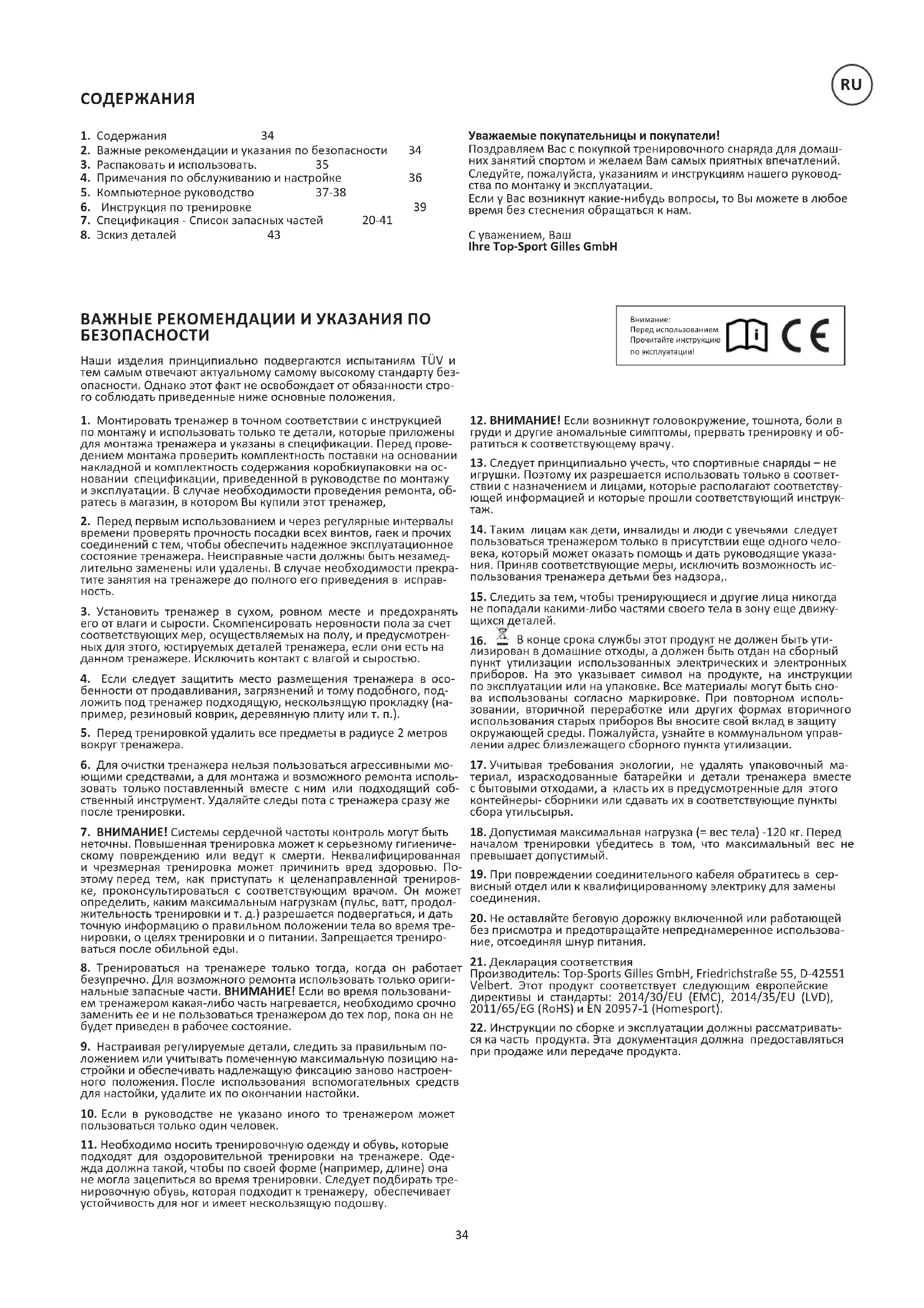 ВАЖНЫЕ РЕКОМЕНДАЦИИ И УКАЗАНИЯ ПО БЕЗОПАСНОСТИ Уважаемые покупательницы и покупатели! Поздравляем Вас с покупкой тренировочного снаряда для домаш- них занятий спортом и желаем Вам самых приятных впечатлений. Следуйте, пожалуйста, указаниям и инструкциям нашего руковод- ства по монтажу и эксплуатации. Если у Вас возникнут какие-нибудь вопросы, то Вы можете в любое время без стеснения обращаться к нам. С уважением, Ваш Ihre Top-Sport Gilles GmbH Наши изделия принципиально подвергаются испытаниям TÜV и тем самым отвечают актуальному самому высокому стандарту без- опасности. Однако этот факт не освобождает от обязанности стро- го соблюдать приведенные ниже основные положения.