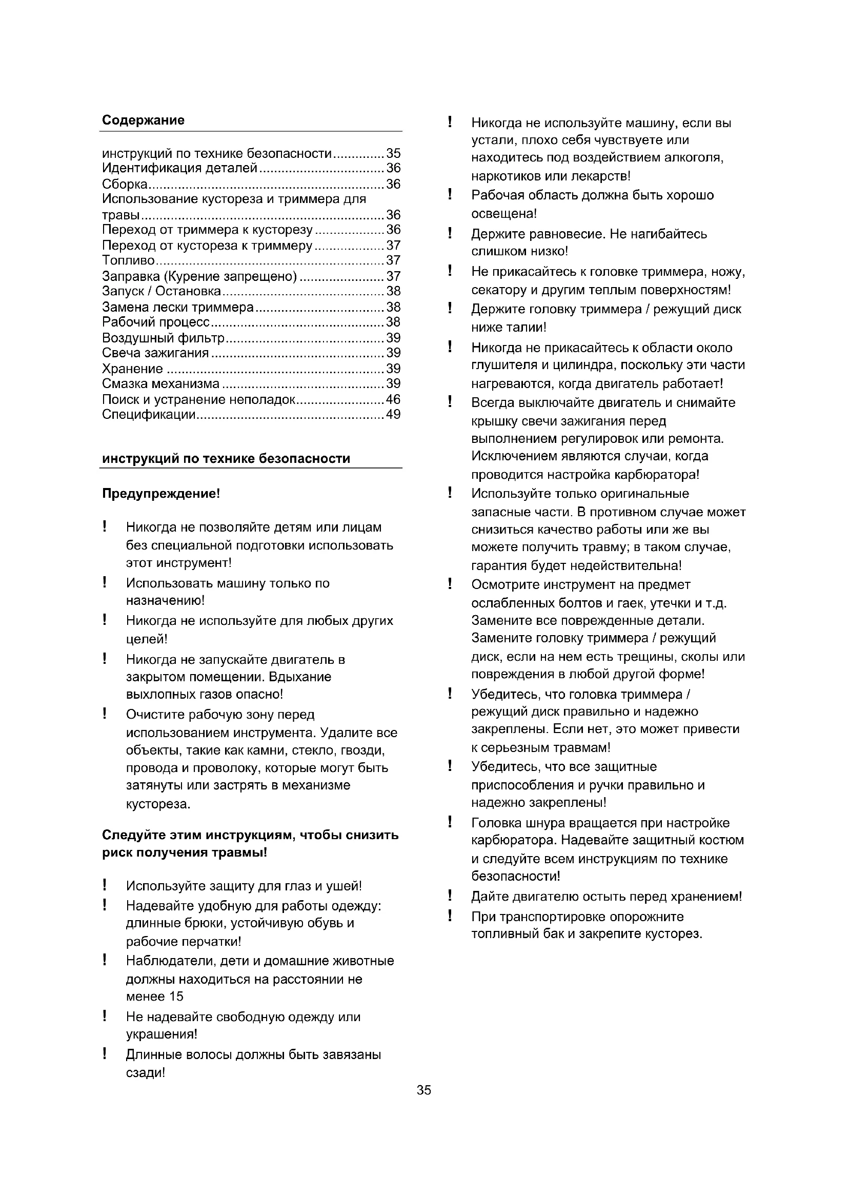 ! Держите равновесие. Не нагибайтесь слишком низко! ! Не прикасайтесь к головке триммера, ножу, секатору и другим теплым поверхностям! ! Держите головку триммера / режущий диск ниже талии! ! Никогда не прикасайтесь к области около глушителя и цилиндра, поскольку эти части нагреваются, когда двигатель работает! ! Всегда выключайте двигатель и снимайте крышку свечи зажигания перед выполнением регулировок или ремонта. Исключением являются случаи, когда проводится настройка карбюратора! ! Используйте только оригинальные запасные части. В противном случае может снизиться качество работы или же вы можете получить травму; в таком случае, гарантия будет недействительна! ! Осмотрите инструмент на предмет ослабленных болтов и гаек, утечки и т.д. Замените все поврежденные детали. Замените головку триммера / режущий диск, если на нем есть трещины, сколы или повреждения в любой другой форме! ! Убедитесь, что головка триммера / режущий диск правильно и надежно закреплены. Если нет, это может привести к серьезным травмам! ! Убедитесь, что все защитные приспособления и ручки правильно и надежно закреплены! ! Головка шнура вращается при настройке карбюратора. Надевайте защитный костюм и следуйте всем инструкциям по технике безопасности! ! Дайте двигателю остыть перед хранением! ! При транспортировке опорожните топливный бак и закрепите кусторез.36