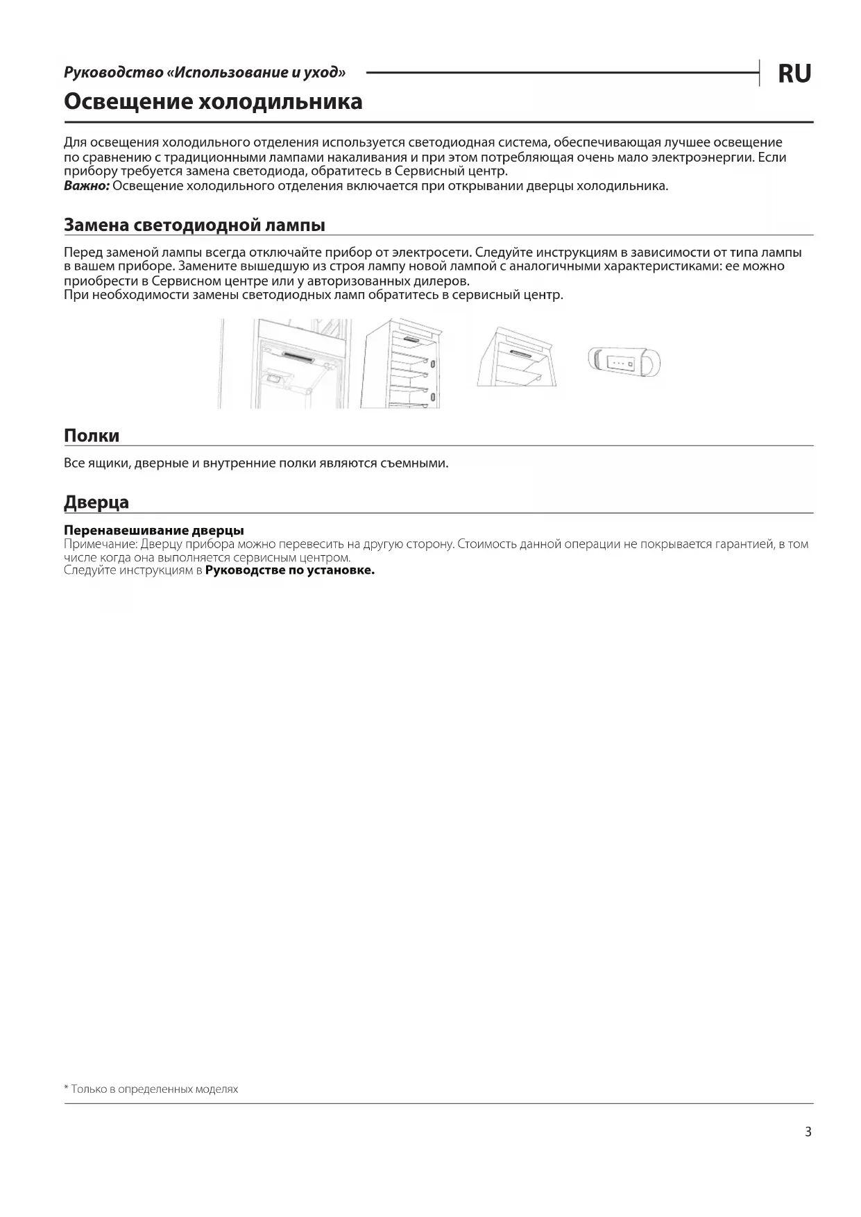 Руководство «Использование и уход» Освещение холодильника Для освещения холодильного отделения используется светодиодная система, обеспечивающая лучшее освещение по сравнению с традиционными лампами накаливания и при этом потребляющая очень мало электроэнергии. Если прибору требуется замена светодиода, обратитесь в Сервисный центр. Важно: Освещение холодильного отделения включается при открывании дверцы холодильника. Замена светодиодной лампы Перед заменой лампы всегда отключайте прибор от электросети. Следуйте инструкциям в зависимости от типа лампы в вашем приборе. Замените вышедшую из строя лампу новой лампой с аналогичными характеристиками: ее можно приобрести в Сервисном центре или у авторизованных дилеров. При необходимости замены светодиодных ламп обратитесь в сервисный центр.
