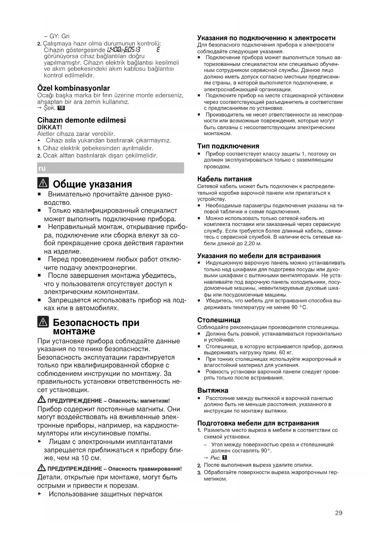 При установке прибора соблюдайте данные указания по технике безопасности. Безопасность эксплуатации гарантируется только при квалифицированной сборке с соблюдением инструкции по монтажу. За правильность установки ответственность не- сет установщик. ПРЕДУПРЕЖДЕНИЕ‒Опасность: магнетизм! Прибор содержит постоянные магниты. Они могут воздействовать на вживленные элек- тронные приборы, например, на кардиости- муляторы или инсулиновые помпы. ▶ Лицам с электронными имплантатами запрещается приближаться к прибору бли- же, чем на 10см. ПРЕДУПРЕЖДЕНИЕ‒Опасность травмирования! Детали, открытые при монтаже, могут быть острыми и привести к порезам. ▶ Использование защитных перчаток Указания по подключению к электросети Для безопасного подключения прибора к электросетисоблюдайте следующие указания.¡ Подключение прибора может выполняться только ав-торизованным специалистом или специально обучен-ным сотрудником сервисной службы. Данное лицодолжно иметь допуск согласно местным предписани-ям страны, в которой выполняется подключение, иэлектроснабжающей организации.¡ Подключите прибор на месте стационарной установкичерез соответствующий разъединитель в соответствиис предписаниями по установке.¡ Производитель не несет ответственности за неисправ-ности или возможные повреждения, которые могутбыть связаны с несоответствующим электрическиммонтажом. Тип подключения ¡ Прибор соответствует классу защиты 1, поэтому ондолжен эксплуатироваться только с заземляющимпроводом. Кабель питания Сетевой кабель может быть подключен к распредели-тельной коробке варочной панели или прилагаться кустройству.¡ Необходимые параметры подключения указаны на ти-повой табличке и схеме подключения.¡ Можно использовать только сетевой кабель изкомплекта поставки или заказанный через сервиснуюслужбу. Если требуется более длинный кабель, свяжи-тесь с сервисной службой. В наличии есть сетевые ка-бели длиной до 2,20м. Указания по мебели для встраивания ¡ Индукционную варочную панель можно устанавливатьтолько над шкафами для подогрева посуды или духо-выми шкафами с вытяжными вентиляторами. Не уста-навливайте под варочную панель холодильники, посу-домоечные машины, невентилируемые духовые шка-фы или посудомоечные машины.¡ Убедитесь, что мебель для встраивания способна вы-держивать температуру не менее 90°C. Соблюдайте рекомендации производителя столешницы.¡ Должна быть ровной, устанавливаться горизонтальнои устойчиво.¡ Столешница, в которую встраивается прибор, должнавыдерживать нагрузку прим. 60кг.¡ При тонких столешницах используйте жаропрочный ивлагостойкий материал для усиления.¡ Ровность установки варочной панели следует прове-рять только после встраивания. ¡ Расстояние между вытяжкой и варочной панельюдолжно быть не меньше расстояния, указанного винструкции по монтажу вытяжки. Подготовка мебели для встраивания
