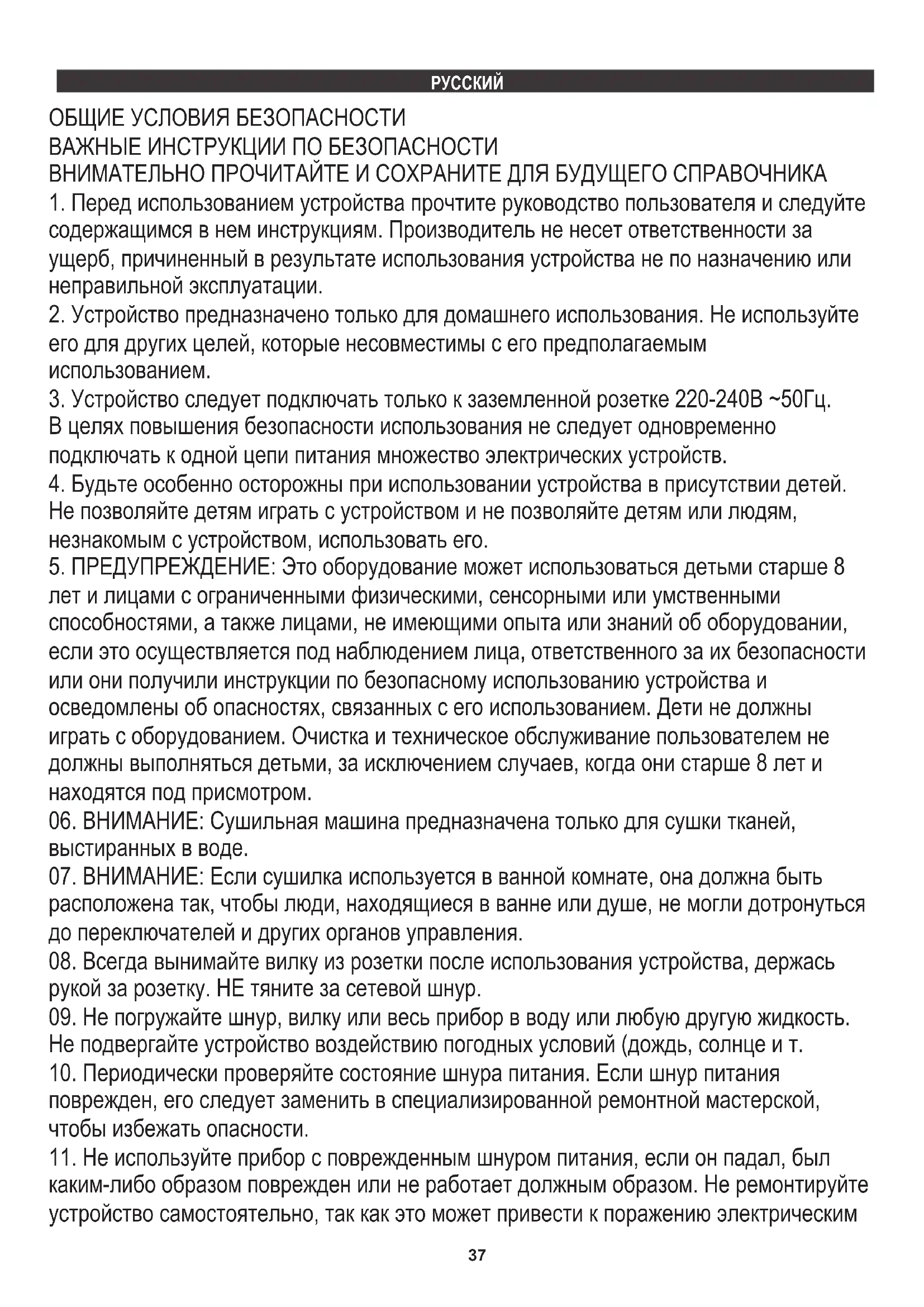 содержащимся в нем инструкциям. Производитель не несет ответственности за ущерб, причиненный в результате использования устройства не по назначению или неправильной эксплуатации. ВНИМАТЕЛЬНО ПРОЧИТАЙТЕ И СОХРАНИТЕ ДЛЯ БУДУЩЕГО СПРАВОЧНИКА ВАЖНЫЕ ИНСТРУКЦИИ ПО БЕЗОПАСНОСТИ ОБЩИЕ УСЛОВИЯ БЕЗОПАСНОСТИ38