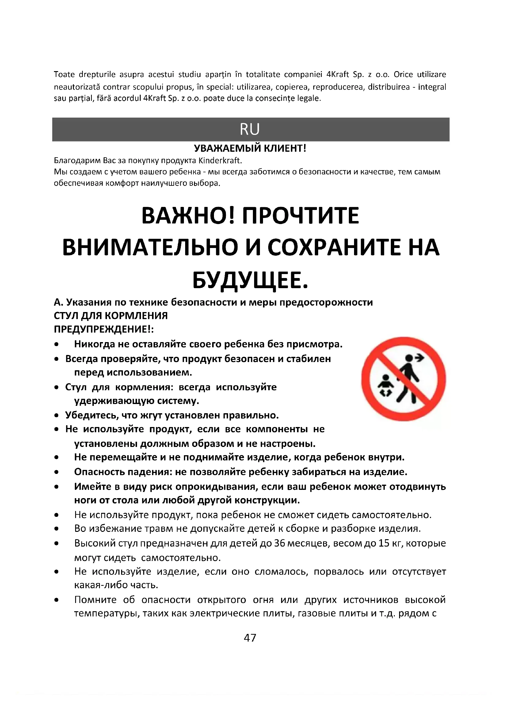 УВАЖАЕМЫЙ КЛИЕНТ! Благодарим Вас за покупку продукта Kinderkraft. Мы создаем с учетом вашего ребенка - мы всегда заботимся о безопасности и качестве, тем самым обеспечивая комфорт наилучшего выбора. ВАЖНО! ПРОЧТИТЕ ВНИМАТЕЛЬНО И СОХРАНИТЕ НА