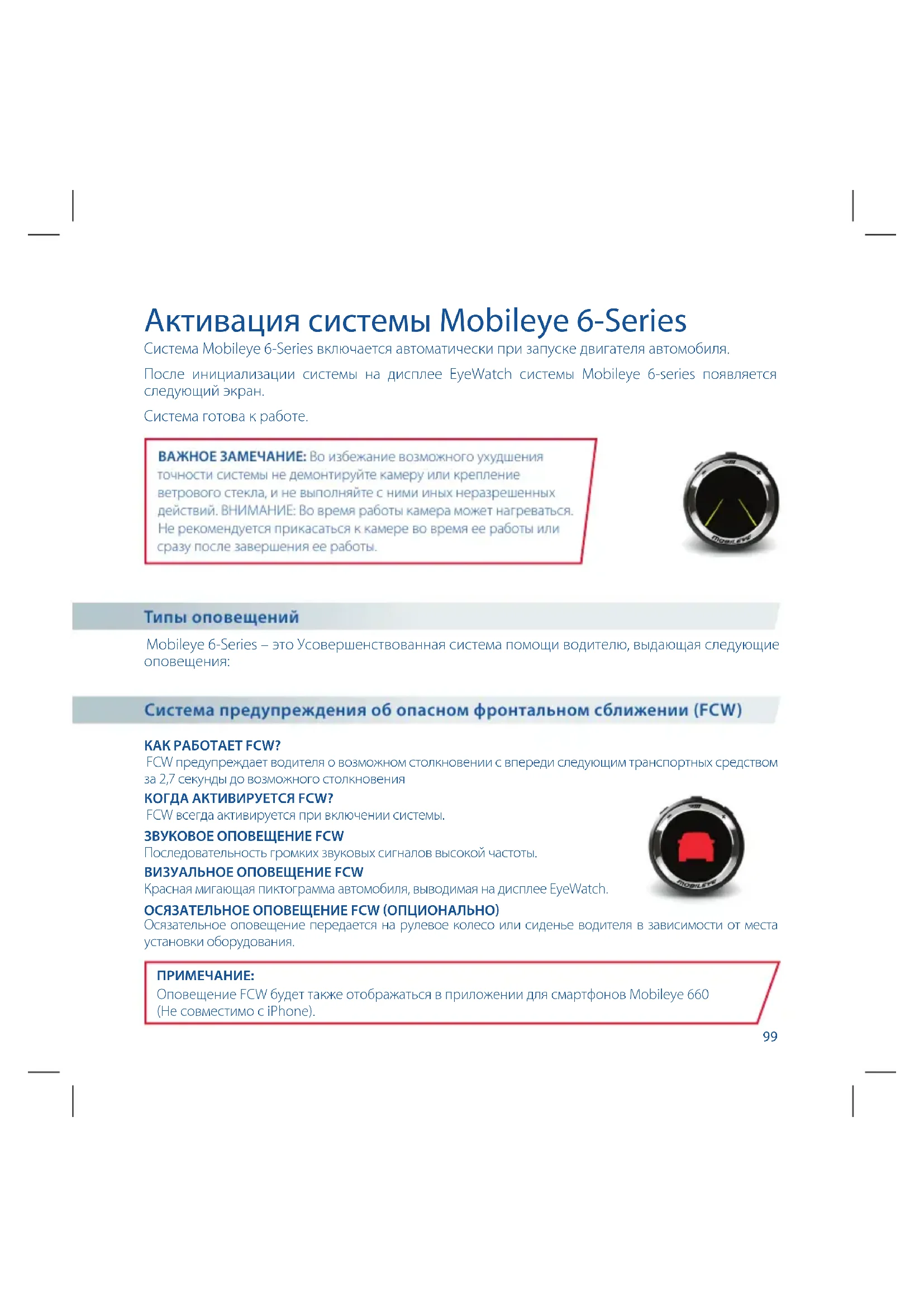 - , , . , . Mobileye, Mobileye / . Mobileye, Mobileye / . Mobileye 6-Series Система Mobileye 6-Series включается автоматически при запуске двигателя автомобиля. После инициализации системы на дисплее EyeWatch системы Mobileye 6-series появляется следующий экран. Система готова к работе. ВАЖНОЕ ЗАМЕЧАНИЕ: Во избежание возможного ухудшения точности системы не демонтируйте камеру или крепление ветрового стекла, и не выполняйте с ними иных неразрешенных действий. ВНИМАНИЕ: Во время работы камера может нагреваться. Не рекомендуется прикасаться к камере во время ее работы или сразу после завершения ее работы. Mobileye 6-Series – это Усовершенствованная система помощи водителю, выдающая следующие оповещения: КАК РАБОТАЕТ FCW? FCW предупреждает водителя о возможном столкновении с впереди следующим транспортных средством за 2,7 секунды до возможного столкновения КОГДА АКТИВИРУЕТСЯ FCW? FCW всегда активируется при включении системы. ЗВУКОВОЕ ОПОВЕЩЕНИЕ FCW Последовательность громких звуковых сигналов высокой частоты. ВИЗУАЛЬНОЕ ОПОВЕЩЕНИЕ FCW Красная мигающая пиктограмма автомобиля, выводимая на дисплее EyeWatch. ОСЯЗАТЕЛЬНОЕ ОПОВЕЩЕНИЕ FCW (ОПЦИОНАЛЬНО) Осязательное оповещение передается на рулевое колесо или сиденье водителя в зависимости от места установки оборудования. ПРИМЕЧАНИЕ: Оповещение FCW будет также отображаться в приложении для смартфонов Mobileye 660 (Не совместимо с iPhone). Типы оповещений Система предупреждения об опасном фронтальном сближении (FCW)99 Активация системы Mobileye 6-Series Система Mobileye 6-Series включается автоматически при запуске двигателя автомобиля. После инициализации системы на дисплее EyeWatch системы Mobileye 6-series появляется следующий экран. Система готова к работе. ВАЖНОЕ ЗАМЕЧАНИЕ: Во избежание возможного ухудшения точности системы не демонтируйте камеру или крепление ветрового стекла, и не выполняйте с ними иных неразрешенных действий. ВНИМАНИЕ: Во время работы камера может нагреваться. Не рекомендуется прикасаться к камере во время ее работы или сразу после завершения ее работы. Mobileye 6-Series – это Усовершенствованная система помощи водителю, выдающая следующие оповещения: КАК РАБОТАЕТ FCW? FCW предупреждает водителя о возможном столкновении с впереди следующим транспортных средством за 2,7 секунды до возможного столкновения КОГДА АКТИВИРУЕТСЯ FCW? FCW всегда активируется при включении системы. ЗВУКОВОЕ ОПОВЕЩЕНИЕ FCW Последовательность громких звуковых сигналов высокой частоты. ВИЗУАЛЬНОЕ ОПОВЕЩЕНИЕ FCW Красная мигающая пиктограмма автомобиля, выводимая на дисплее EyeWatch. ОСЯЗАТЕЛЬНОЕ ОПОВЕЩЕНИЕ FCW (ОПЦИОНАЛЬНО) Осязательное оповещение передается на рулевое колесо или сиденье водителя в зависимости от места установки оборудования. ПРИМЕЧАНИЕ: Оповещение FCW будет также отображаться в приложении для смартфонов Mobileye 660 (Не совместимо с iPhone). Типы оповещений Система предупреждения об опасном фронтальном сближении (FCW)100 КАК РАБОТАЕТ UFCW? UFCW предупреждает водителя об опасности столкновения на невысокой скорости с впереди идущим транспортным средством. КОГДА АКТИВИРУЕТСЯ UFCW? UFCW активируется на скорости ниже 30 км/ч. ЗВУКОВОЕ ОПОВЕЩЕНИЕ UFCW Последовательность громких коротких звуковых сигналов высокой частоты. ВИЗУАЛЬНОЕ ОПОВЕЩЕНИЕ UFCW Красная мигающая пиктограмма автомобиля, выводимая на дисплее EyeWatch. ОСЯЗАТЕЛЬНОЕ ОПОВЕЩЕНИЕ UFCW (ОПЦИОНАЛЬНО) Осязательное оповещение передается на руле