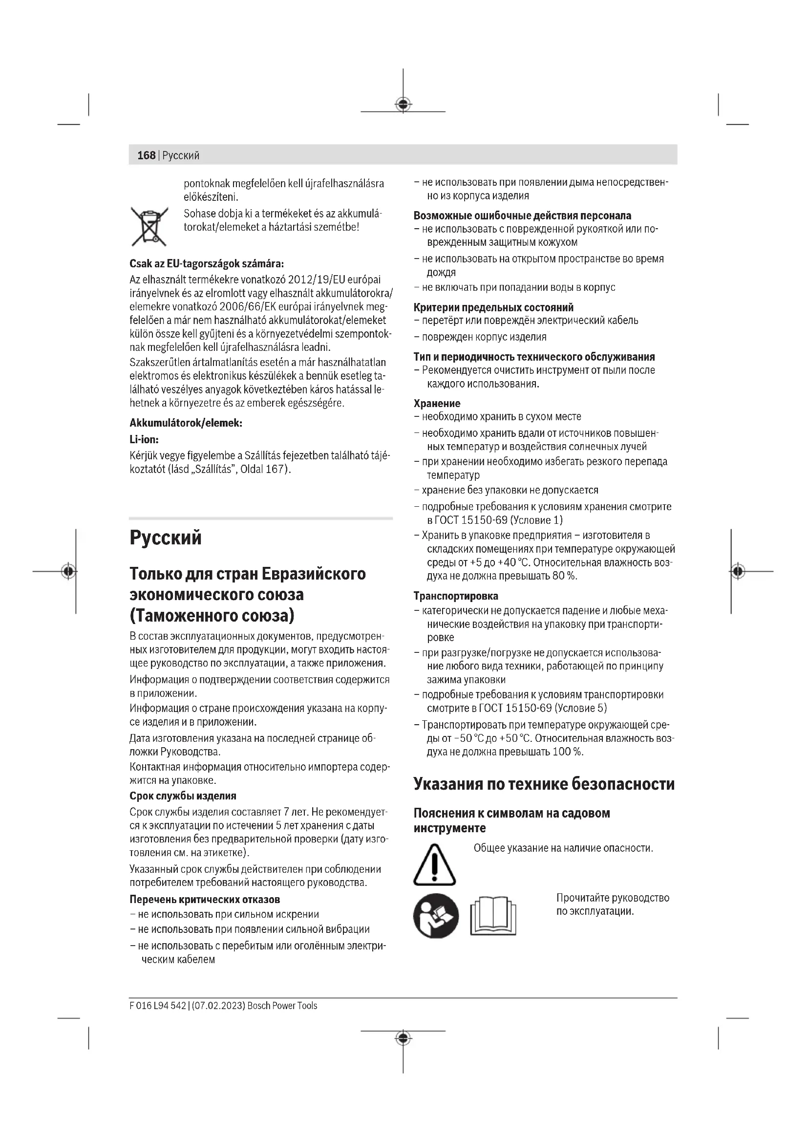 – при разгрузке/погрузке не допускается использова- ние любого вида техники, работающей по принципу зажима упаковки – подробные требования к условиям транспортировки смотрите в ГОСТ15150-69 (Условие5) – Транспортировать при температуре окружающей сре- ды от −50°С до +50°С. Относительная влажность воз- духа не должна превышать 100%. Указания по технике безопасности Пояснения к символам на садовом инструменте Общее указание на наличие опасности. Прочитайте руководство по эксплуатации. F 016 L94 542 | (07.02.2023) Bosch Power ToolsРусский | 169 Надевайте средства защиты головы, орга- нов зрения и слуха. Носите нескользящую обувь. Носите защитные перчатки. ПРЕДУПРЕЖДЕНИЕ: Не допускайте на место работы посторонних. Не использовать во время дождя. ПРЕДУПРЕЖДЕНИЕ: Рас- стояние между элек- троинструментом и сто- ронними лицами должно составлять не менее 15 м (50 футов). ПРЕДУПРЕЖДЕНИЕ: Берегитесь разлетаю- щихся частей. Остерегайтесь обратного удара. Не используйте ножи измельчителя. Не используйте зубчатые ножи. ПРЕДУПРЕЖДЕНИЕ: Перед работами по тех- обслуживанию отсоедините аккумулятор. Не используйте для очистки садового инструмента очиститель высокого давления или садовый шланг. Общие указания по технике безопасности для электроинструментов