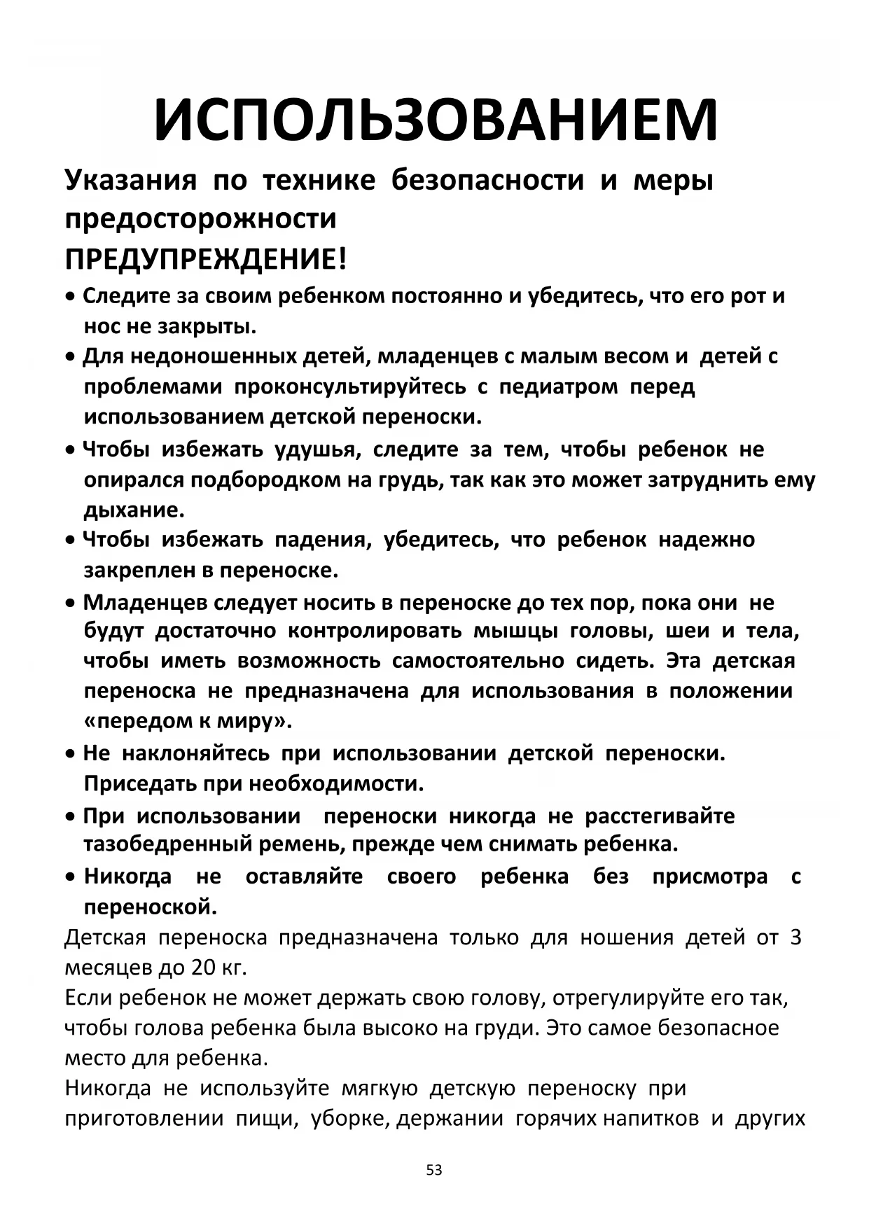 - Никогда не оставляйте своего ребенка без присмотра с переноской. Детская переноска предназначена только для ношения детей от 3 месяцев до 20 кг. Если ребенок не может держать свою голову, отрегулируйте его так, чтобы голова ребенка была высоко на груди. Это самое безопасное место для ребенка. Никогда не используйте мягкую детскую переноску при приготовлении пищи, уборке, держании горячих напитков и других54 видах деятельности, которые могут подвергнуть вашего ребенка ожогам или химикатам. При питье горячих напитков соблюдайте осторожность, чтобы не обжечь ребенка горячей жидкостью во время переноски. Детская переноска используется для ношения только одного ребенка. Ваши движения, а также движения вашего ребенка могут повлиять на ваш баланс. Будьте осторожны при наклоне вперед или в сторону. Детская переноска не подходит для использования во время занятий спортом, таких как бег, езда на велосипеде, плавание и катание на