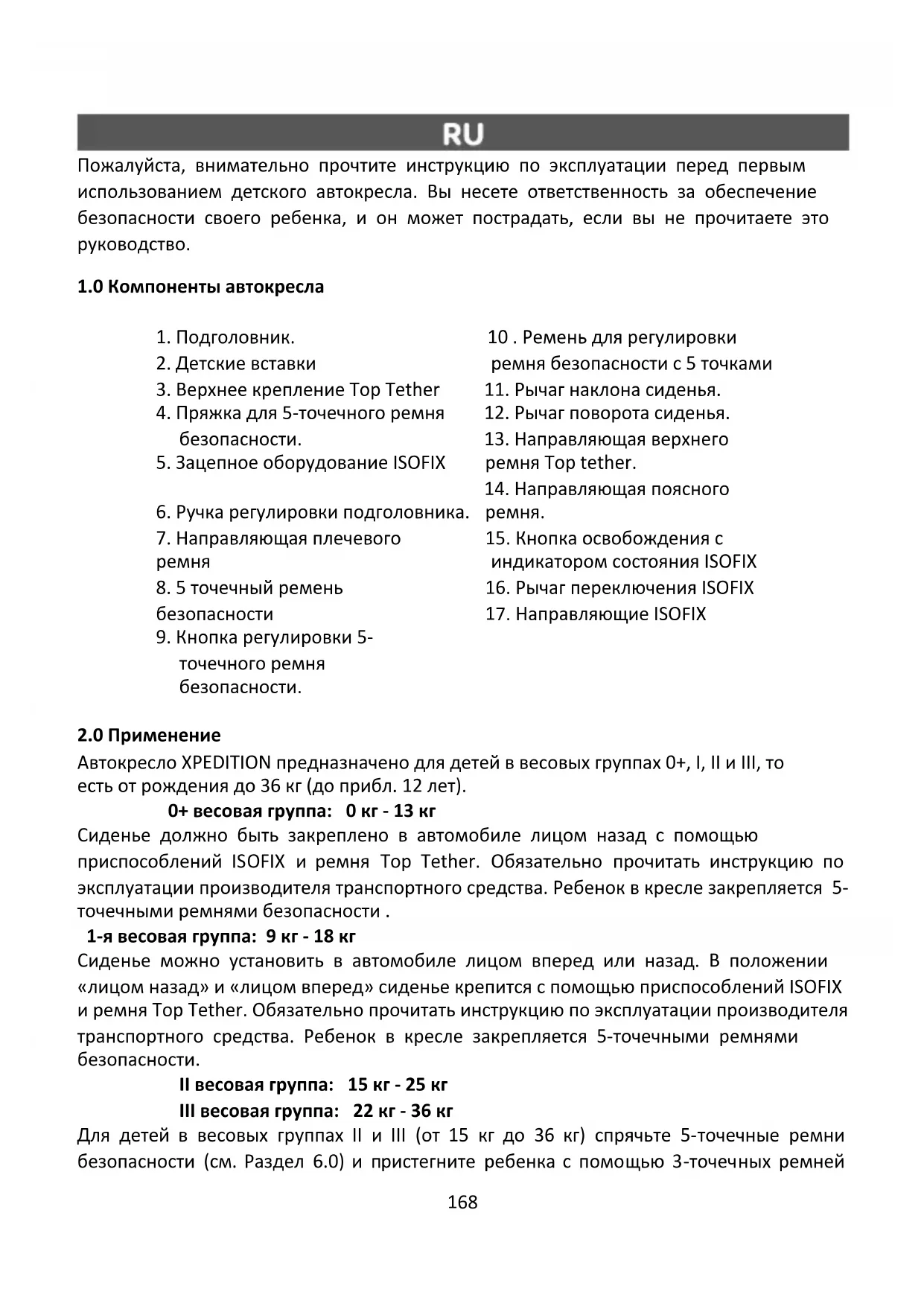 Автокресло XPEDITION предназначено для детей в весовых группах 0+, I, II и III, то есть от рождения до 36 кг (до прибл. 12 лет). 0+ весовая группа: 0 кг - 13 кг Сиденье должно быть закреплено в автомобиле лицом назад с помощью приспособлений ISOFIX и ремня Top Tether. Обязательно прочитать инструкцию по эксплуатации производителя транспортного средства. Ребенок в кресле закрепляется 5- точечными ремнями безопасности . 1-я весовая группа: 9 кг - 18 кг Сиденье можно установить в автомобиле лицом вперед или назад. В положении «лицом назад» и «лицом вперед» сиденье крепится с помощью приспособлений ISOFIX и ремня Top Tether. Обязательно прочитать инструкцию по эксплуатации производителя транспортного средства. Ребенок в кресле закрепляется 5-точечными ремнями безопасности. II весовая группа: 15 кг - 25 кг III весовая группа: 22 кг - 36 кг Для детей в весовых группах II и III (от 15 кг до 36 кг) спрячьте 5-точечные ремни безопасности (см. Раздел 6.0) и пристегните ребенка с помощью 3-точечных ремней169 безопасности для взрослых с дополнительными креплениями ISOFIX или только на 3 - точечный ремень безопасности для взрослых, см. разделы 5.3, 5.4. Обязательно прочитать инструкцию по эксплуатации производителя транспортного средства.