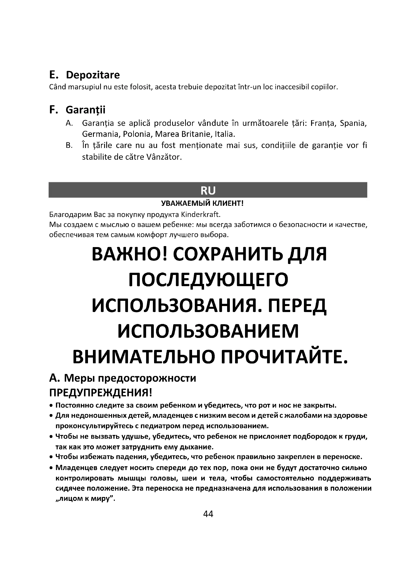 УВАЖАЕМЫЙ КЛИЕНТ! Благодарим Вас за покупку продукта Kinderkraft. Мы создаем с мыслью о вашем ребенке: мы всегда заботимся о безопасности и качестве, обеспечивая тем самым комфорт лучшего выбора. ВАЖНО! СОХРАНИТЬ ДЛЯ ПОСЛЕДУЮЩЕГО ИСПОЛЬЗОВАНИЯ. ПЕРЕД ИСПОЛЬЗОВАНИЕМ ВНИМАТЕЛЬНО ПРОЧИТАЙТЕ. A. Меры предосторожности ПРЕДУПРЕЖДЕНИЯ!