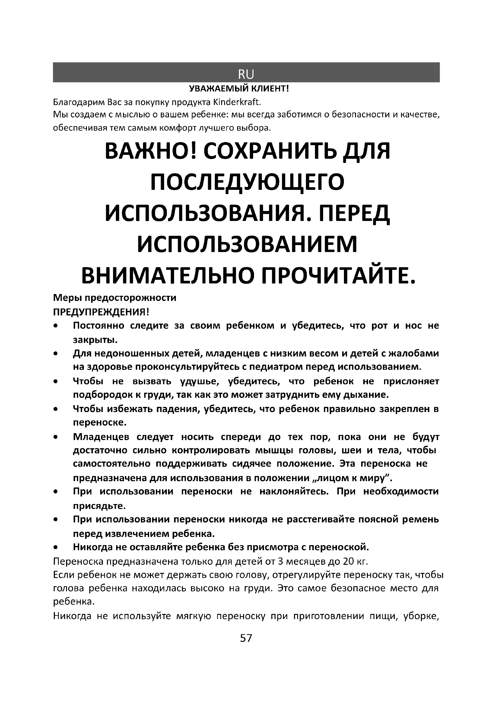 УВАЖАЕМЫЙ КЛИЕНТ! Благодарим Вас за покупку продукта Kinderkraft. Мы создаем с мыслью о вашем ребенке: мы всегда заботимся о безопасности и качестве, обеспечивая тем самым комфорт лучшего выбора. ВАЖНО! СОХРАНИТЬ ДЛЯ ПОСЛЕДУЮЩЕГО ИСПОЛЬЗОВАНИЯ. ПЕРЕД ИСПОЛЬЗОВАНИЕМ ВНИМАТЕЛЬНО ПРОЧИТАЙТЕ. Меры предосторожности ПРЕДУПРЕЖДЕНИЯ!
