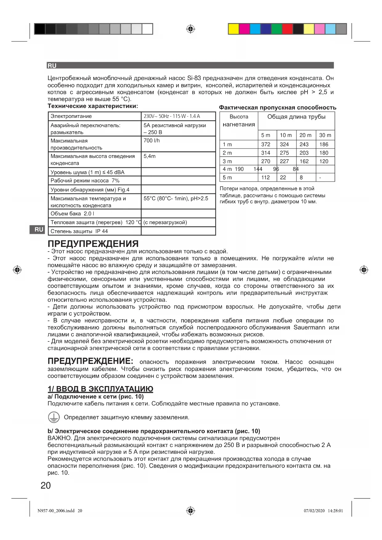 5,4m Уровень шума (1 m) ≤ 45 dBA Рабочий режим насоса 7% Уровни обнаружения (мм) Fig.4 Максимальная температура и кислотность конденсата 55°C (80°C- 1min), pH>2.5 Объем бака 2.0 l Тепловая защита (перегрев) 120 °C (с перезагрузкой) Степень защиты IP 44 ПРЕДУПРЕЖДЕНИЯ - Этот насос предназначен для использования только с водой. - Этот насос предназначен для использования только в помещениях. Не погружайте и/или не помещайте насос во влажную среду и защищайте от замерзания. - Устройство не предназначено для использования лицами (в том числе детьми) с ограниченными физическими, сенсорными или умственными способностями или лицами, не обладающими соответствующим опытом и знаниями, кроме случаев, когда со стороны ответственного за их безопасность лица обеспечивается надлежащий контроль или предварительный инструктаж относительно использования устройства. - Дети должны использовать устройство под присмотром взрослых. Не допускайте, чтобы дети играли с устройством. - В случае неисправности и, в частности, повреждения кабеля питания любые операции по техобслуживанию должны выполняться службой послепродажного обслуживания Sauermann или лицами с аналогичной квалификацией, чтобы избежать возможных рисков. - Для моделей без электрической розетки необходимо предусмотреть возможность отключения от стационарной электрической сети в соответствии с правилами установки. ПРЕДУПРЕЖДЕНИЕ: опасность поражения электрическим током. Насос оснащен заземляющим кабелем. Чтобы снизить риск поражения электрическим током, убедитесь, что он соответствующим образом соединен с устройством заземления. 1/ ВВОД В ЭКСПЛУАТАЦИЮ a/ Подключение к сети (рис. 10) Подключите кабель питания к сети. Соблюдайте местные правила по установке. Определяет защитную клемму заземления. b/ Электрическое соединение предохранительного контакта (pис. 10) ВАЖНО. Для электрического подключения системы сигнализации предусмотрен беспотенциальный размыкающий контакт с напряжением до 250 В и разрывной способностью 2 A при индуктивной нагрузке и 5 А при резистивной нагрузке. Рекомендуется использовать этот контакт для прекращения производства холода в случае опасности переполнения (рис. 10). Сведения о модификации предохранительного контакта см. на рис. 10.