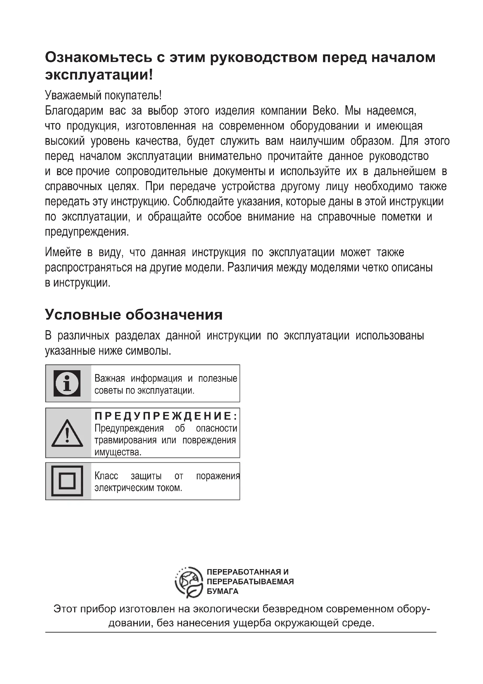 VRT 61814 VR VRT 61818 VW VRT 61821 VD VRT 61814 VB 01M-8811553200-1122-11 01M-8811563200-1122-11 01M-8811543200-1122-11 01M-8816823200-1122-11 01M-8912753200-1122-03Ознакомьтесь с этим руководством перед началом эксплуатации! Уважаемый покупатель! Благодарим вас за выбор этого изделия компании Beko. Мы надеемся, что продукция, изготовленная на современном оборудовании и имеющая высокий уровень качества, будет служить вам наилучшим образом. Для этого перед началом эксплуатации внимательно прочитайте данное руководство и все прочие сопроводительные документы и используйте их в дальнейшем в справочных целях. При передаче устройства другому лицу необходимо также передать эту инструкцию. Соблюдайте указания, которые даны в этой инструкции по эксплуатации, и обращайте особое внимание на справочные пометки и предупреждения. Имейте в виду, что данная инструкция по эксплуатации может также распространяться на другие модели. Различия между моделями четко описаны в инструкции. Условные обозначения В различных разделах данной инструкции по эксплуатации использованы указанные ниже символы.