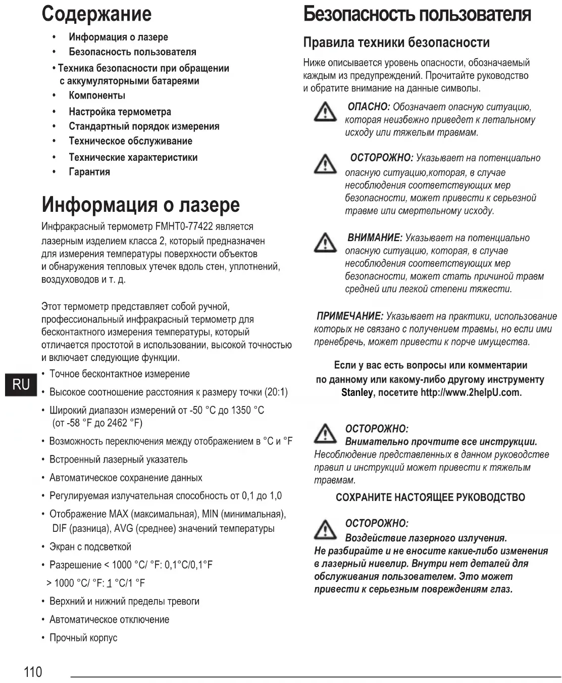 Гарантийные обязательства не распространяются на дефекты, ставшие причиной непреднамеренного повреждения и износа, некорректного использования или самостоятельных модификаций и ремонта данного продукта без разрешения компании Stanley. Ремонт или замена в рамках настоящей Гарантии не влияет на срок Гарантии. В рамках разрешения законодательства компания Stanley не будет нести ответственность за косвенный или последующий ущерб или любой ущерб, каким-либо образом вытекающий из пользования данного прибора. Запрещается вносить изменения в настоящую Гарантию без разрешения Stanley. Данная гарантия не вносит изменений в законные права покупателей данного изделия. Данное гарантийное обязательство должно регулироваться и толковаться в соответствии с законодательством страны, где было приобретено данное изделие, при условии что как компания Stanley, так и покупатель безоговорочно соглашаются подчиняться исключительной юрисдикции судов этой страны относительно любых претензий и вопросов, связанных с данной гарантией. Калибровка и обслуживание не входят в гарантийные