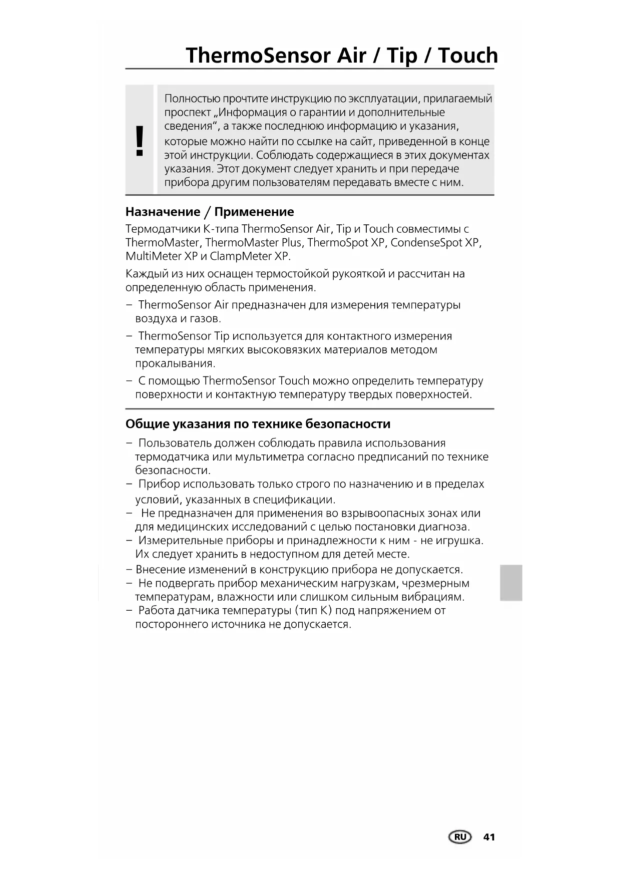 Термодатчики K-типа ThermoSensor Air, Tip и Touch совместимы с ThermoMaster, ThermoMaster Plus, ThermoSpot XP, CondenseSpot XP, MultiMeter XP и ClampMeter XP. Каждый из них оснащен термостойкой рукояткой и рассчитан на определенную область применения. – ThermoSensor Air предназначен для измерения температуры воздуха и газов. – ThermoSensor Tip используется для контактного измерения температуры мягких высоковязких материалов методом прокалывания. – С помощью ThermoSensor Touch можно определить температуру поверхности и контактную температуру твердых поверхностей. – Пользователь должен соблюдать правила использования термодатчика или мультиметра согласно предписаний по технике безопасности. – Прибор использовать только строго по назначению и в пределах условий, указанных в спецификации. – Не предназначен для применения во взрывоопасных зонах или для медицинских исследований с целью постановки диагноза. – Измерительные приборы и принадлежности к ним - не игрушка. Их следует хранить в недоступном для детей месте. – Внесение изменений в конструкцию прибора не допускается. – Не подвергать прибор механическим нагрузкам, чрезмерным температурам, влажности или слишком сильным вибрациям. – Работа датчика температуры (тип K) под напряжением от постороннего источника не допускается. Общие указания по технике безопасности Назначение / Применение Полностью прочтите инструкцию по эксплуатации, прилагаемый проспект „Информация о гарантии и дополнительные сведения“, а также последнюю информацию и указания, которые можно найти по ссылке на сайт, приведенной в конце этой инструкции. Соблюдать содержащиеся в этих документах указания. Этот документ следует хранить и при передаче прибора другим пользователям передавать вместе с ним.