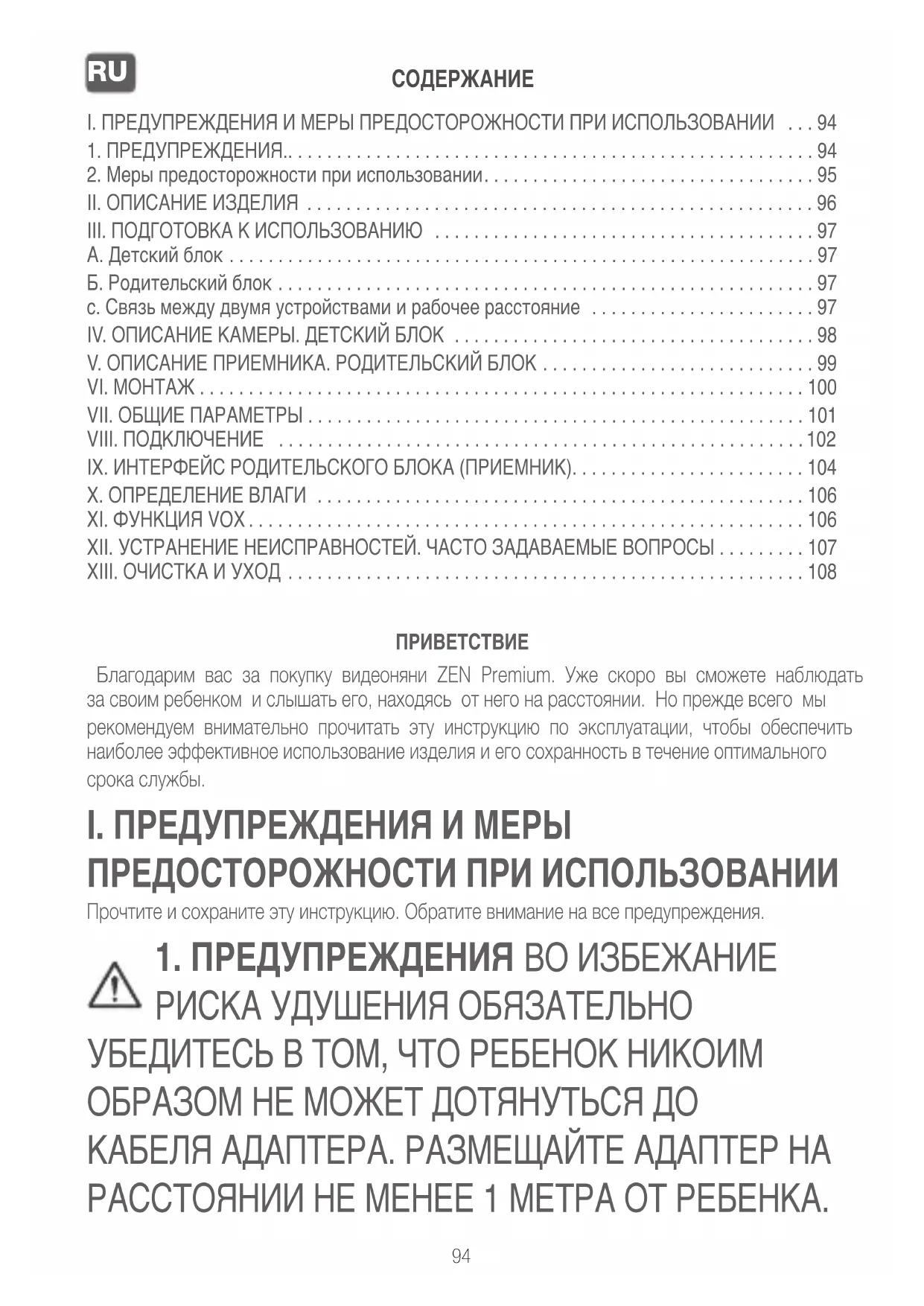 XIII. ОЧИСТКА И УХОД . . . . . . . . . . . . . . . . . . . . . . . . . . . . . . . . . . . . . . . . . . . . . . . . . . . . . 108 ПРИВЕТСТВИЕ Благодарим вас за покупку видеоняни ZEN Premium. Уже скоро вы сможете наблюдать за своим ребенком и слышать его, находясь от него на расстоянии. Но прежде всего мы рекомендуем внимательно прочитать эту инструкцию по эксплуатации, чтобы обеспечить наиболее эффективное использование изделия и его сохранность в течение оптимального срока службы.