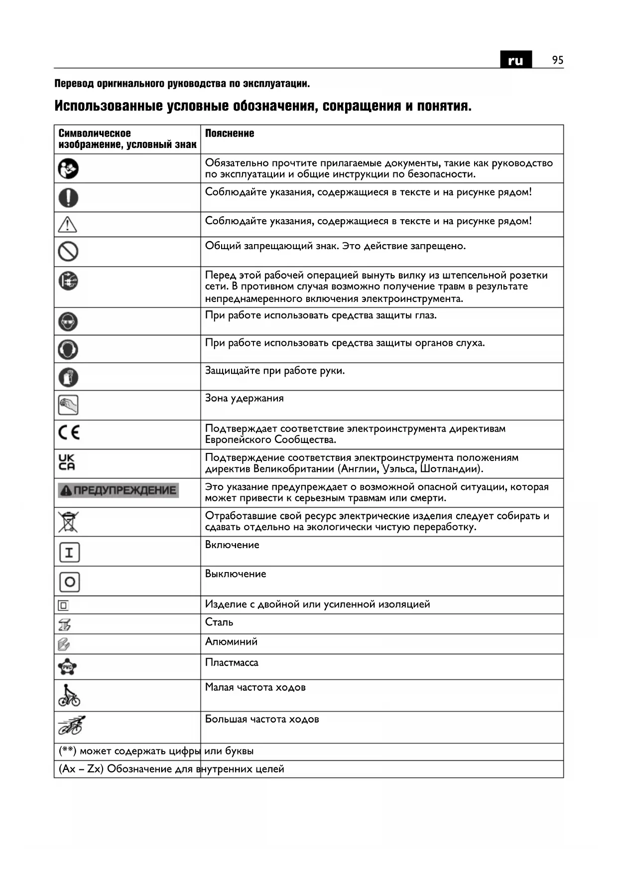 Обязательно прочтите прилагаемые документы, такие как руководство по эксплуатации и общие инструкции по безопасности. Соблюдайте указания, содержащиеся в тексте и на рисунке рядом! Соблюдайте указания, содержащиеся в тексте и на рисунке рядом! Общий запрещающий знак. Это действие запрещено. Перед этой рабочей операцией вынуть вилку из штепсельной розетки сети. В противном случая возможно получение травм в результате непреднамеренного включения электроинструмента. При работе использовать средства защиты глаз. При работе использовать средства защиты органов слуха. Защищайте при работе руки. Зона удержания Подтверждает соответствие электроинструмента директивам Европейского Сообщества. Подтверждение соответствия электроинструмента положениям директив Великобритании (Англии, Уэльса, Шотландии). Это указание предупреждает о возможной опасной ситуации, которая может привести к серьезным травмам или смерти. Отработавшие свой ресурс электрические изделия следует собирать и сдавать отдельно на экологически чистую переработку.