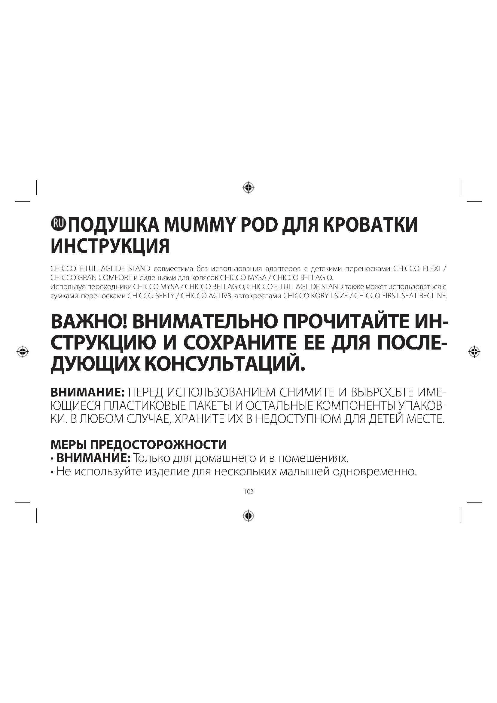 CHICCO E-LULLAGLIDE STAND совместима без использования адаптеров с детскими переносками CHICCO FLEXI / CHICCO GRAN COMFORT и сиденьями для колясок CHICCO MYSA / CHICCO BELLAGIO. Используя переходники CHICCO MYSA / CHICCO BELLAGIO, CHICCO E-LULLAGLIDE STAND также может использоваться с сумками-переносками CHICCO SEETY / CHICCO ACTIV3, автокреслами CHICCO KORY I-SIZE / CHICCO FIRST-SEAT RECLINE. ВАЖНО! ВНИМАТЕЛЬНО ПРОЧИТАЙТЕ ИН- СТРУКЦИЮ И СОХРАНИТЕ ЕЕ ДЛЯ ПОСЛЕ- ДУЮЩИХ КОНСУЛЬТАЦИЙ. ВНИМАНИЕ: ПЕРЕД ИСПОЛЬЗОВАНИЕМ СНИМИТЕ И ВЫБРОСЬТЕ ИМЕ- ЮЩИЕСЯ ПЛАСТИКОВЫЕ ПАКЕТЫ И ОСТАЛЬНЫЕ КОМПОНЕНТЫ УПАКОВ- КИ. В ЛЮБОМ СЛУЧАЕ, ХРАНИТЕ ИХ В НЕДОСТУПНОМ ДЛЯ ДЕТЕЙ МЕСТЕ. МЕРЫ ПРЕДОСТОРОЖНОСТИ