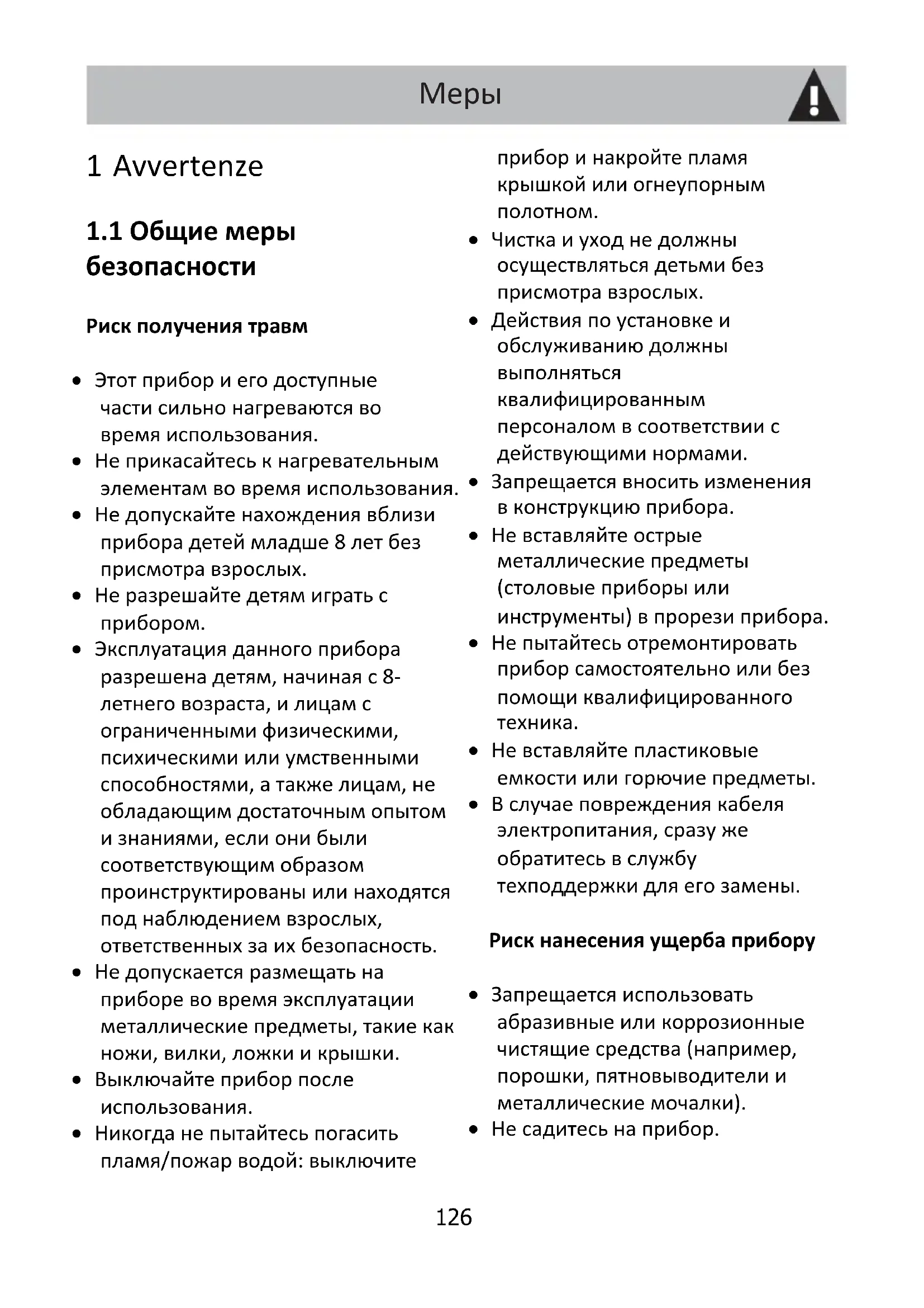 - Никогда не пытайтесь погасить пламя/пожар водой: выключите прибор и накройте пламя крышкой или огнеупорным