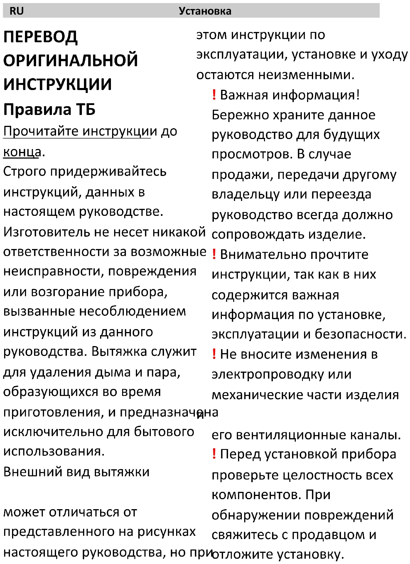 Строго придерживайтесь инструкций, данных в настоящем руководстве. Изготовитель не несет никакой ответственности за возможные неисправности, повреждения или возгорание прибора, вызванные несоблюдением инструкций из данного руководства. Вытяжка служит для удаления дыма и пара, образующихся во время приготовления, и предназначена исключительно для бытового использования. Внешний вид вытяжки может отличаться от представленного на рисунках настоящего руководства, но при этом инструкции по эксплуатации, установке и уходу остаются неизменными. ! Важная информация! Бережно храните данное руководство для будущих просмотров. В случае продажи, передачи другому владельцу или переезда руководство всегда должно сопровождать изделие. ! Внимательно прочтите инструкции, так как в них содержится важная информация по установке, эксплуатации и безопасности. ! Не вносите изменения в электропроводку или механические части изделия
