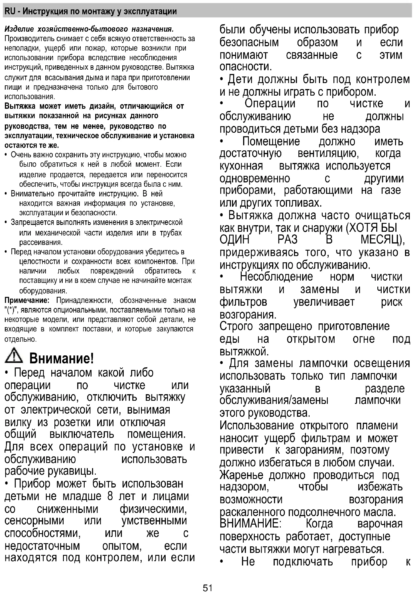 - Вытяжка НИКОГДА не должна использоваться, как опорная поверхность, если только не указано иначе.