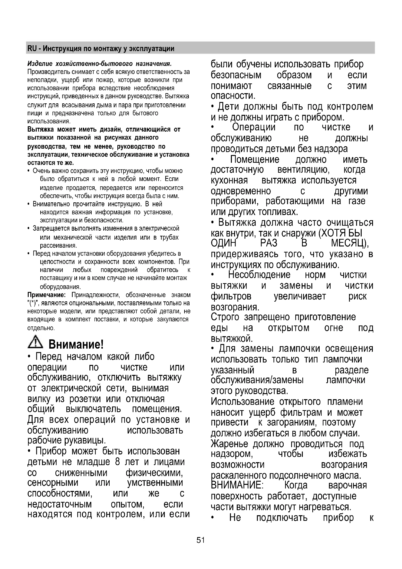 - Вытяжка НИКОГДА не должна использоваться, как опорная поверхность, если только не указано иначе.