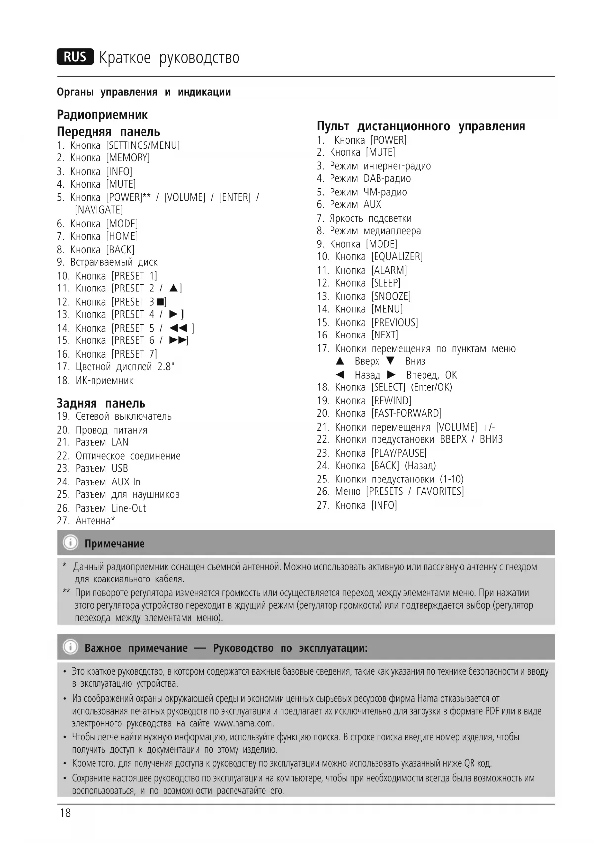 При повороте регулятора изменяется громкость или осуществляется переход между элементами меню. При нажатии этого регулятора устройство переходит в ждущий режим (регулятор громкости) или подтверждается выбор (регулятор перехода между элементами меню). Важное примечание — Руководство по эксплуатации: