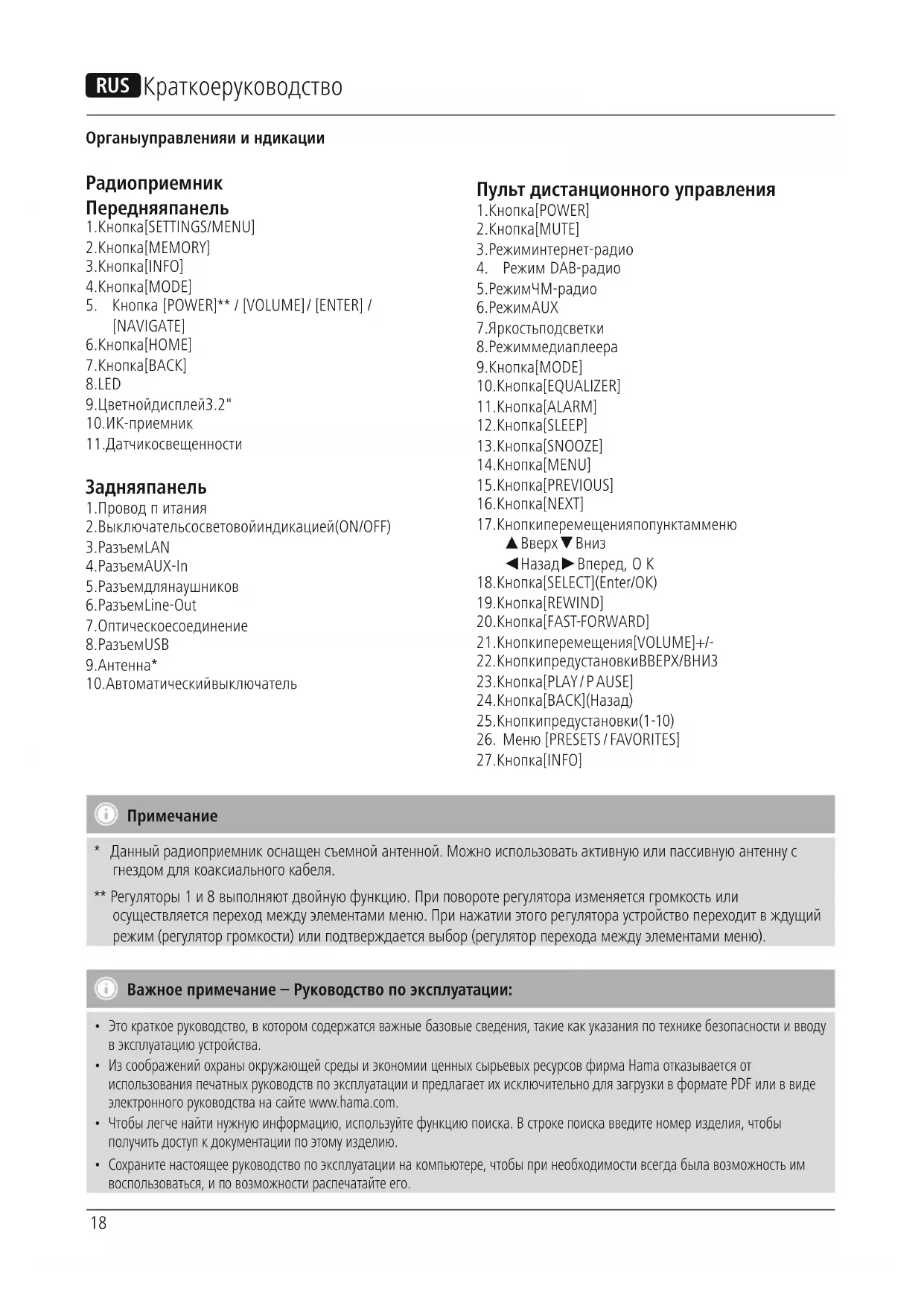 - Данный радиоприемник оснащен съемной антенной. Можноиспользовать активную или пассивную антенну с гнездом для коаксиальногокабеля. ** Регуляторы 1 и 8 выполняют двойную функцию. Приповороте регулятораизменяется громкость или осуществляется переход между элементамименю. Принажатииэтого регулятораустройствопереходит вждущий режим (регулятор громкости) илиподтверждается выбор (регуляторпереходамеждуэлементами меню). Важное примечание – Руководство по эксплуатации: