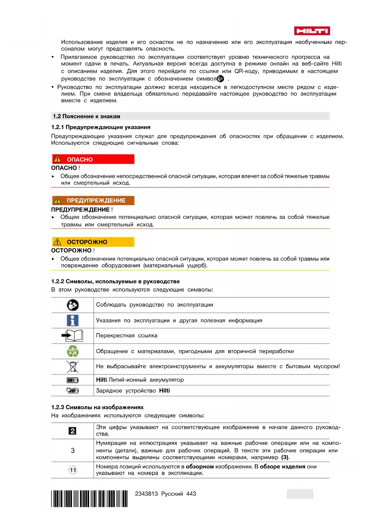 В этом руководстве используются следующие символы: Соблюдать руководство по эксплуатации Указания по эксплуатации и другая полезная информация Перекрестная ссылка Обращение с материалами, пригодными для вторичной переработки Не выбрасывайте электроинструменты и аккумуляторы вместе с бытовым мусором! Hilti Литий-ионный аккумулятор Зарядное устройство Hilti