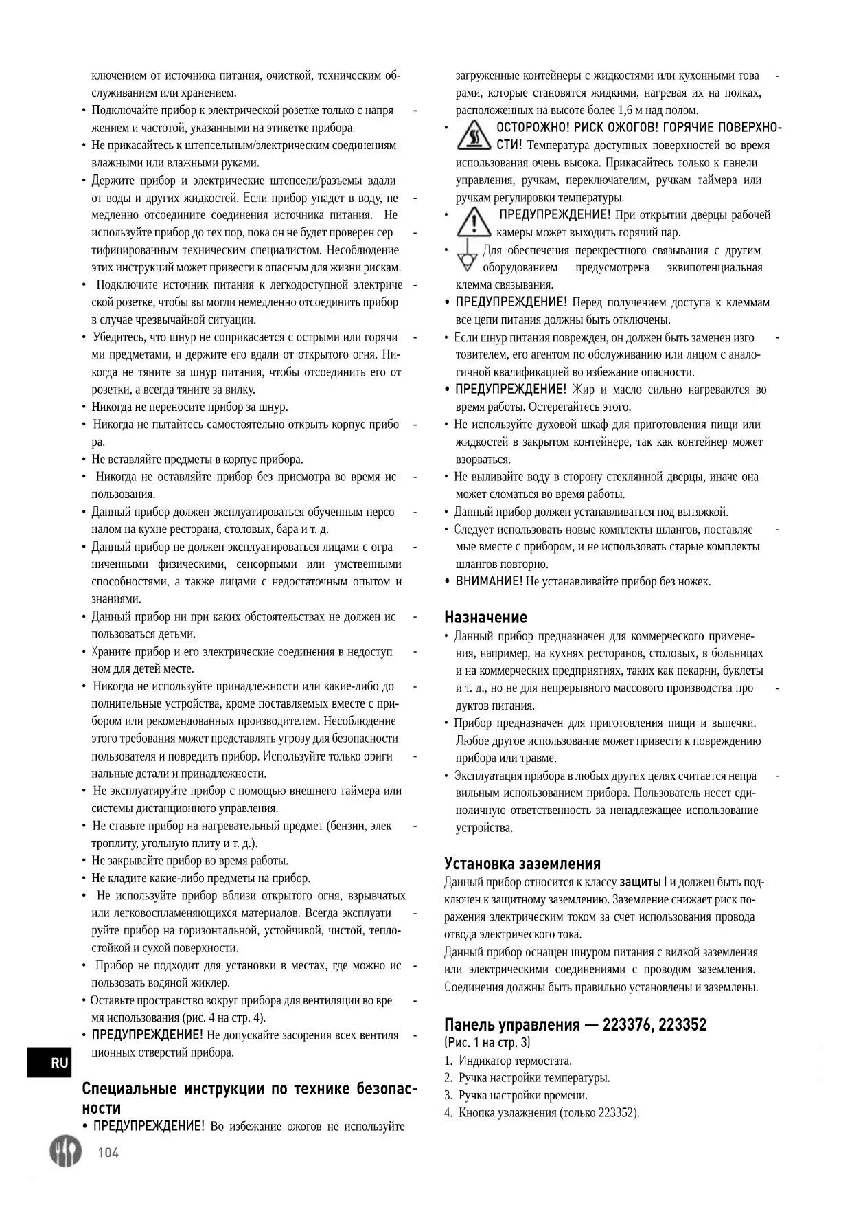 вильным использованием прибора. Пользователь несет еди- ноличную ответственность за ненадлежащее использование устройства. Установка заземления Данный прибор относится к классу защиты I и должен быть под- ключен к защитному заземлению. Заземление снижает риск по- ражения электрическим током за счет использования провода отвода электрического тока. Данный прибор оснащен шнуром питания с вилкой заземления или электрическими соединениями с проводом заземления. Соединения должны быть правильно установлены и заземлены. Панель управления — 223376, 223352 (Рис. 1 на стр. 3)
