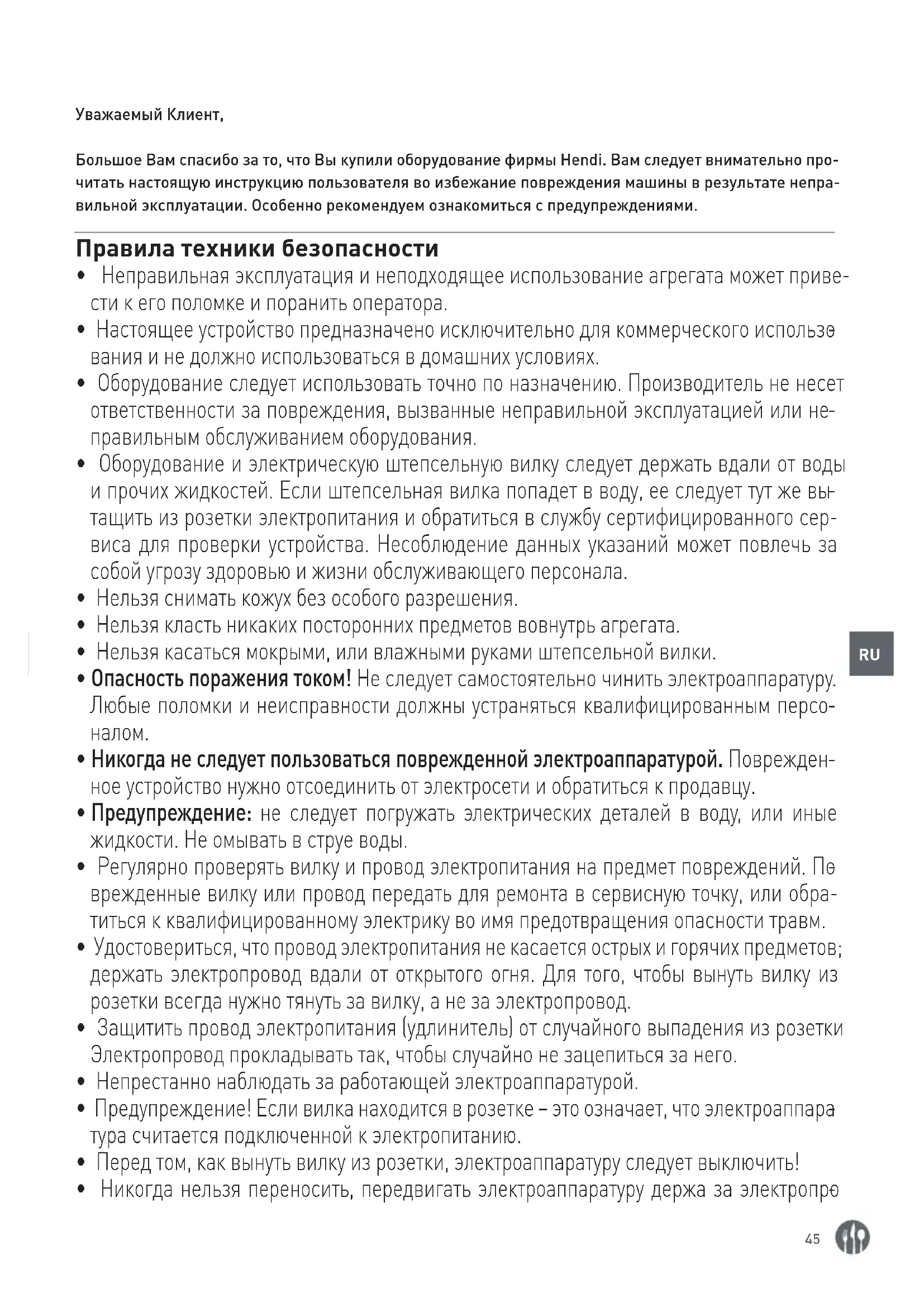 Уважаемый Клиент, Большое Вам спасибо за то, что Вы купили оборудование фирмы Hendi. Вам следует внимательно про- читать настоящую инструкцию пользователя во избежание повреждения машины в результате непра- вильной эксплуатации. Особенно рекомендуем ознакомиться с предупреждениями. Правила техники безопасности