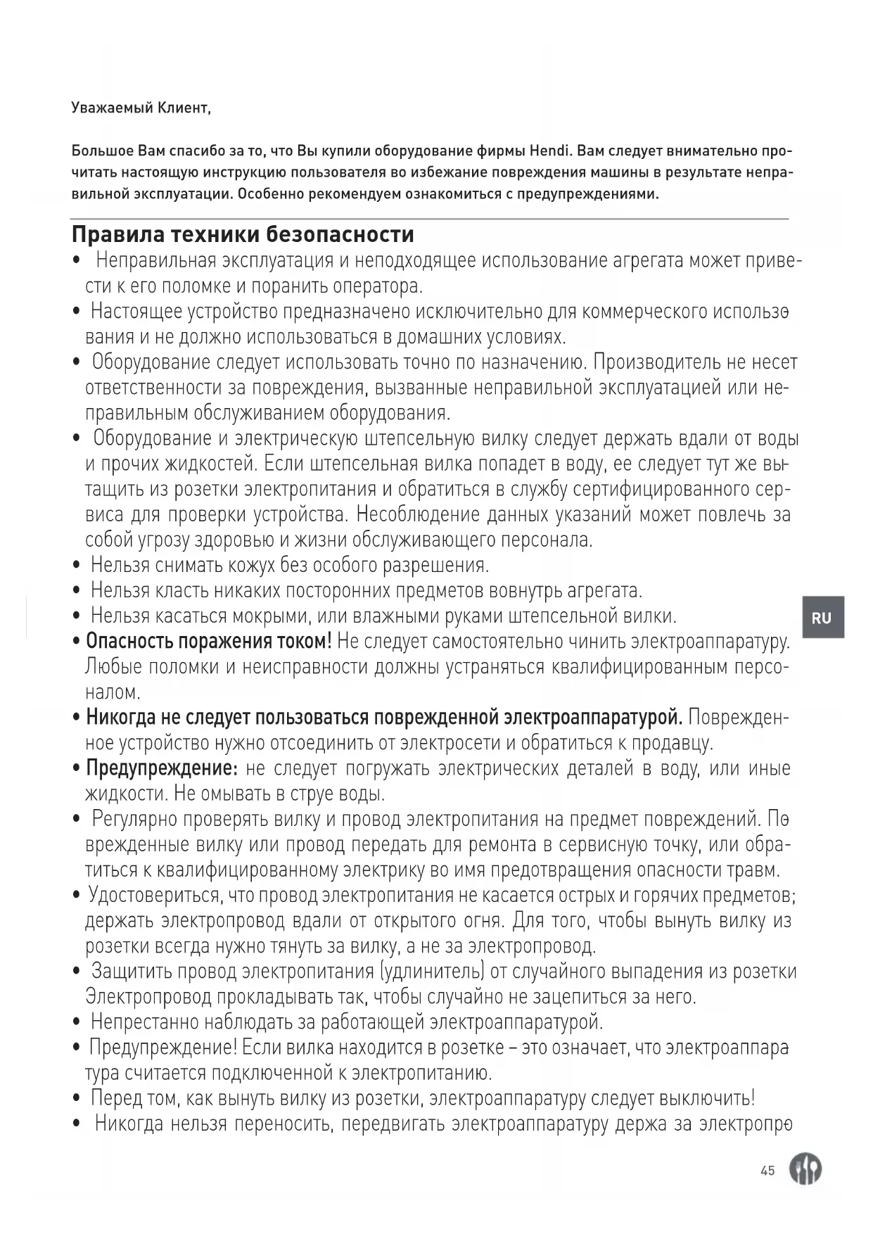 Уважаемый Клиент, Большое Вам спасибо за то, что Вы купили оборудование фирмы Hendi. Вам следует внимательно про- читать настоящую инструкцию пользователя во избежание повреждения машины в результате непра- вильной эксплуатации. Особенно рекомендуем ознакомиться с предупреждениями. Правила техники безопасности