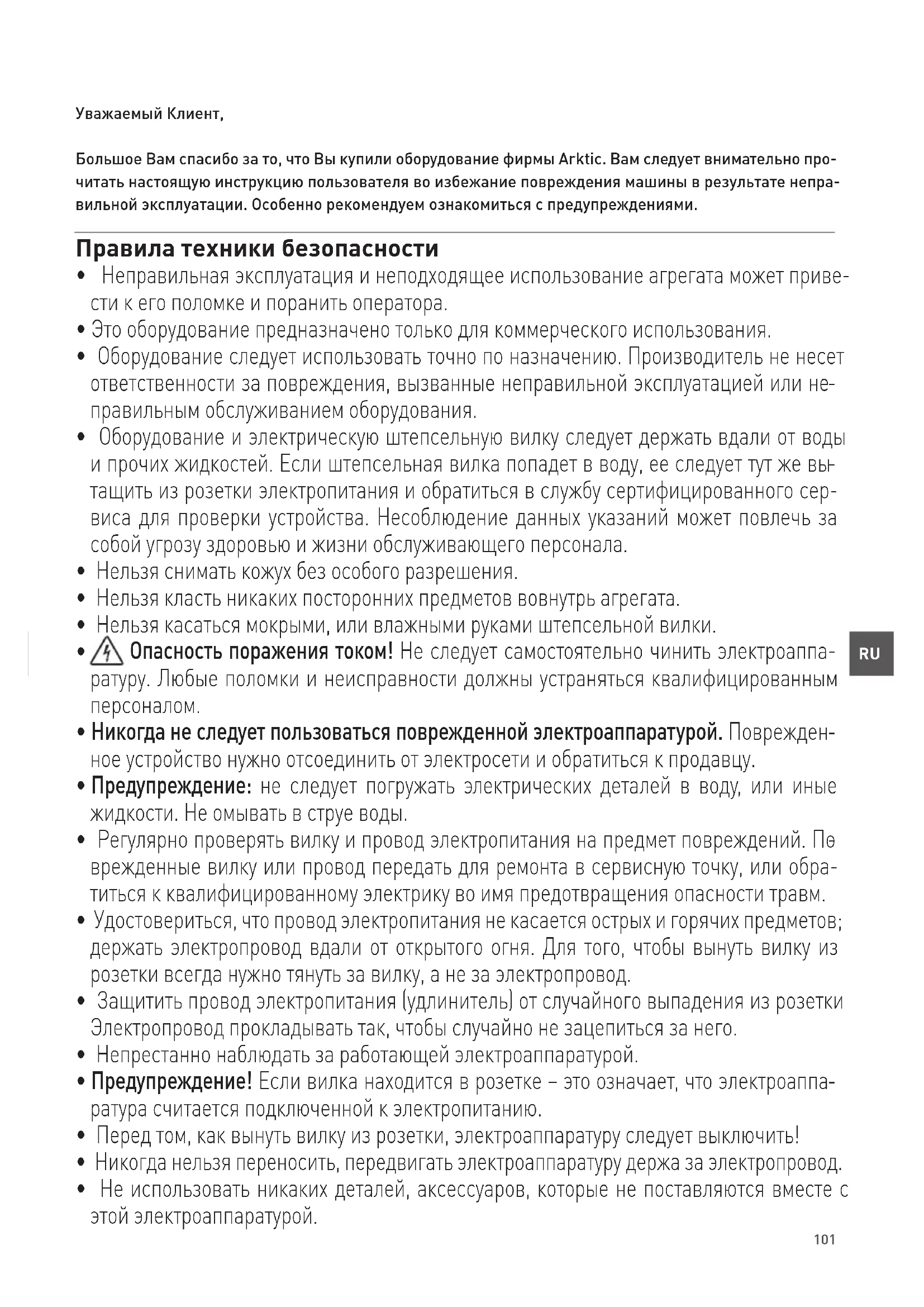 Уважаемый Клиент, Большое Вам спасибо за то, что Вы купили оборудование фирмы Arktic. Вам следует внимательно про- читать настоящую инструкцию пользователя во избежание повреждения машины в результате непра- вильной эксплуатации. Особенно рекомендуем ознакомиться с предупреждениями. Правила техники безопасности