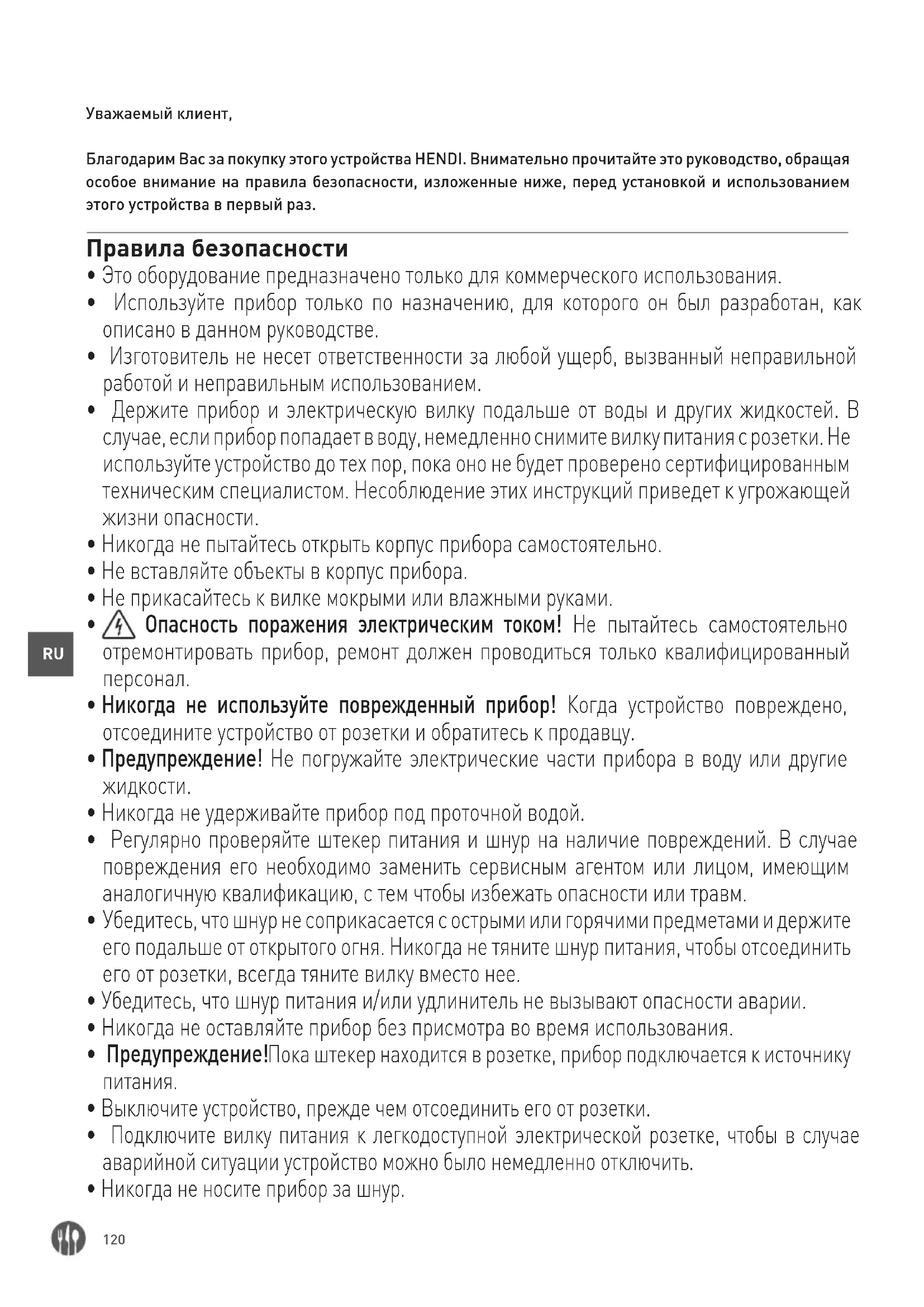 Уважаемый клиент, Благодарим Вас за покупку этого устройства HENDI. Внимательно прочитайте это руководство, обращая особое внимание на правила безопасности, изложенные ниже, перед установкой и использованием этого устройства в первый раз. Правила безопасности
