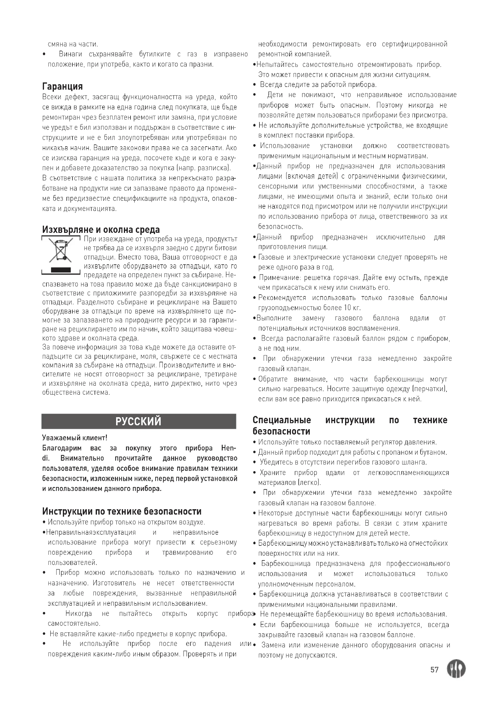 - Поместите газовый баллон в предназначенный для этого контейнер с максимальными размерами газового баллона: диаметром 40 см и высотой 59 см. ПРЕДУПРЕЖДЕНИЕ: некоторые части прибора могут нагреваться. Держите детей вдали от барбекю. Подключение газового баллона 1 = Основной ответвитель 2 = Регулятор давления 3 = Газовый шланг 4 = газовый баллон 5 = Резиновая шайба Прикрепите регулятор давления к газовому баллону с помощью большой гайки. Всегда проверяйте наличие резиновой уплотнительной шайбы в гайке. Плотно затяните гайку. Обратите внимание, что гайка имеет левую резьбу. Проверьте соединения на наличие утечек, используя водный раствор мыла. Каждый раз при подключении нового заполненного газового баллона необходимо установить новую резиновую шайбу. В большинстве случаев ваш поставщик газа будет прилагать его к баллону. Зажигание газового барбекюшницы Поверните ручку вправо до упора. Нажмите на ручку и поверните ее влево в максимальное положение. Удерживая ручку нажатой, несколько раз нажмите кнопку зажигания. Удерживайте ручку нажатой в течение примерно 10 секунд. Горелка продолжит гореть. Дайте барбекю сгореть в течение примерно 15 минут, прежде чем положить мясо на решетку, так как горелки должны сначала нагреть камеру, прежде чем она сможет передать тепло на верхнюю решетку. Потушение газового барбекюшницы: Поверните ручку вправо до упора. Примечание! После выключения горелок подождите примерно 10 минут, прежде чем снова зажечь горелки. При отсоединении газового баллона или после выключения горелок всегда выключайте регулятор газового баллона! Примечание! После выключения горелок подождите примерно 10 минут, прежде чем снова зажечь горелки. После выключения горелок всегда выключайте основной кран на газовом баллоне и кран на приборе! Если на вашем барбекюшнице есть решетка Перед первым использованием решетки выполните следующую процедуру:
