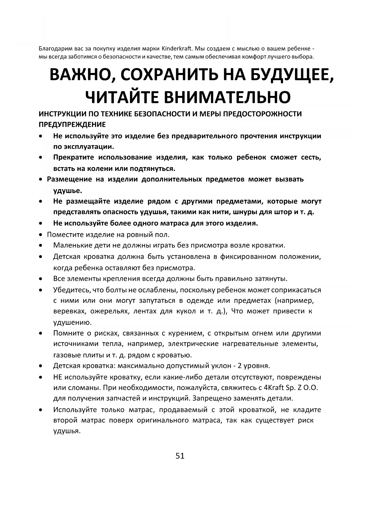 Уважаемый клиент!51 Благодарим вас за покупку изделия марки Kinderkraft. Мы создаем с мыслью о вашем ребенке - мы всегда заботимся о безопасности и качестве, тем самым обеспечивая комфорт лучшего выбора. ВАЖНО, СОХРАНИТЬ НА БУДУЩЕЕ, ЧИТАЙТЕ ВНИМАТЕЛЬНО ИНСТРУКЦИИ ПО ТЕХНИКЕ БЕЗОПАСНОСТИ И МЕРЫ ПРЕДОСТОРОЖНОСТИ ПРЕДУПРЕЖДЕНИЕ