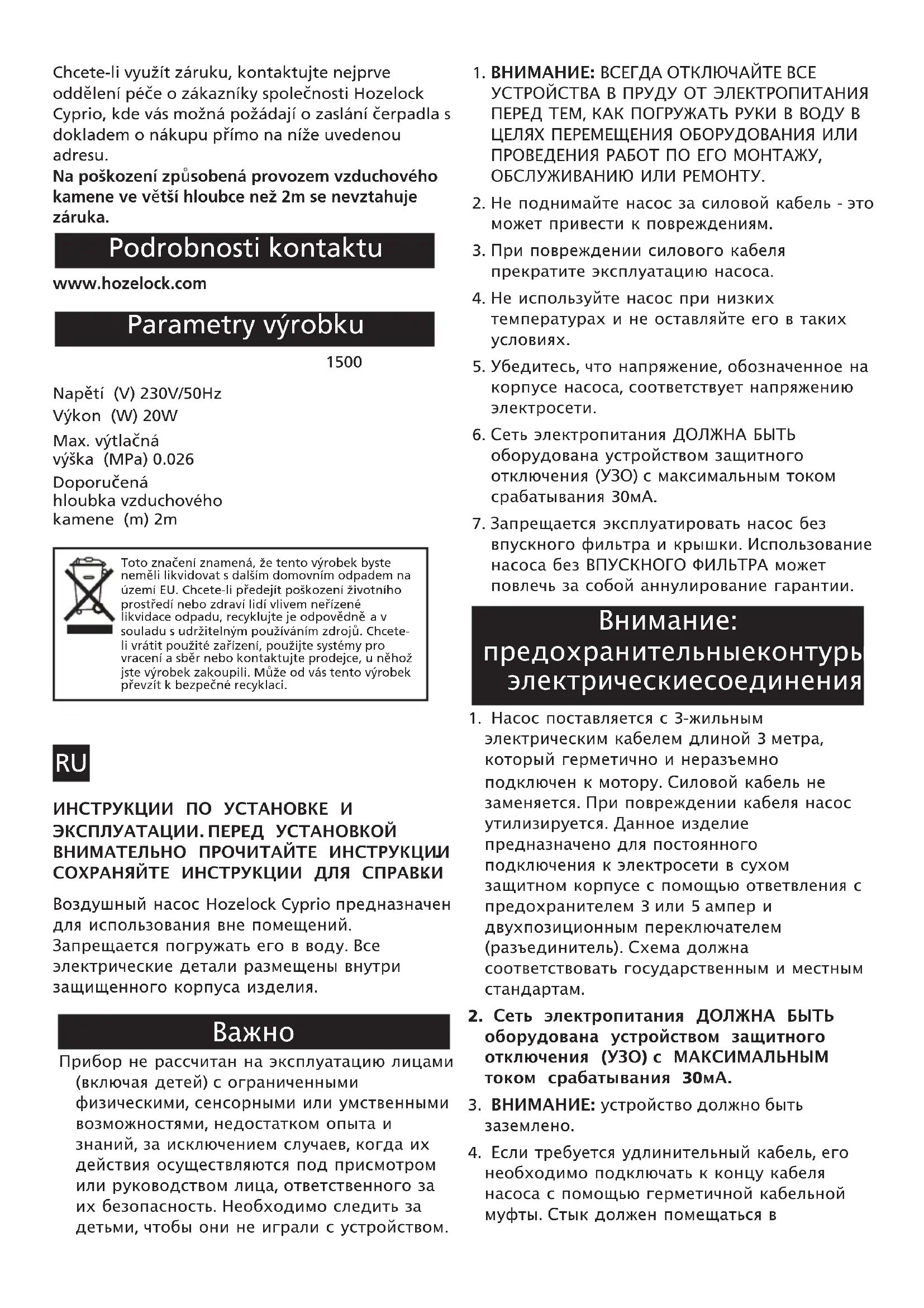 срабатыванию автоматического выключателя. Отключите устройство от электросети и проверьте причину перегрева, осмотрев в том числе мембрану, откидные клапаны и губчатые фильтры на входе/выходе. Если вам необходима дополнительная консультация, верните неиспаовное изделие в магазин или обратитесь в отдел обслуживания потребителей Hozelock Cyprio по телефону +44 (0) 121 313 1122. Если данный насос, за исключением мембраны, откидных клапанов, губчатых фильтров на входе и выходе и уплотнительных колец, выйдет из строя в течение 2 лет с момента его приобретения, он будет бесплатно заменен или отремонтирован по нашему усмотрению, кроме случаев, когда, по нашему мнению, он был поврежден или использовался не по назначению. Мы не несем ответственность за повреждения в результате чрезвычайного происшествия, неправильной установки или эксплуатации. Ответственность ограничивается заменой неисправного насоса. Данная гарантия не передается. Она не ущемляет ваши законные