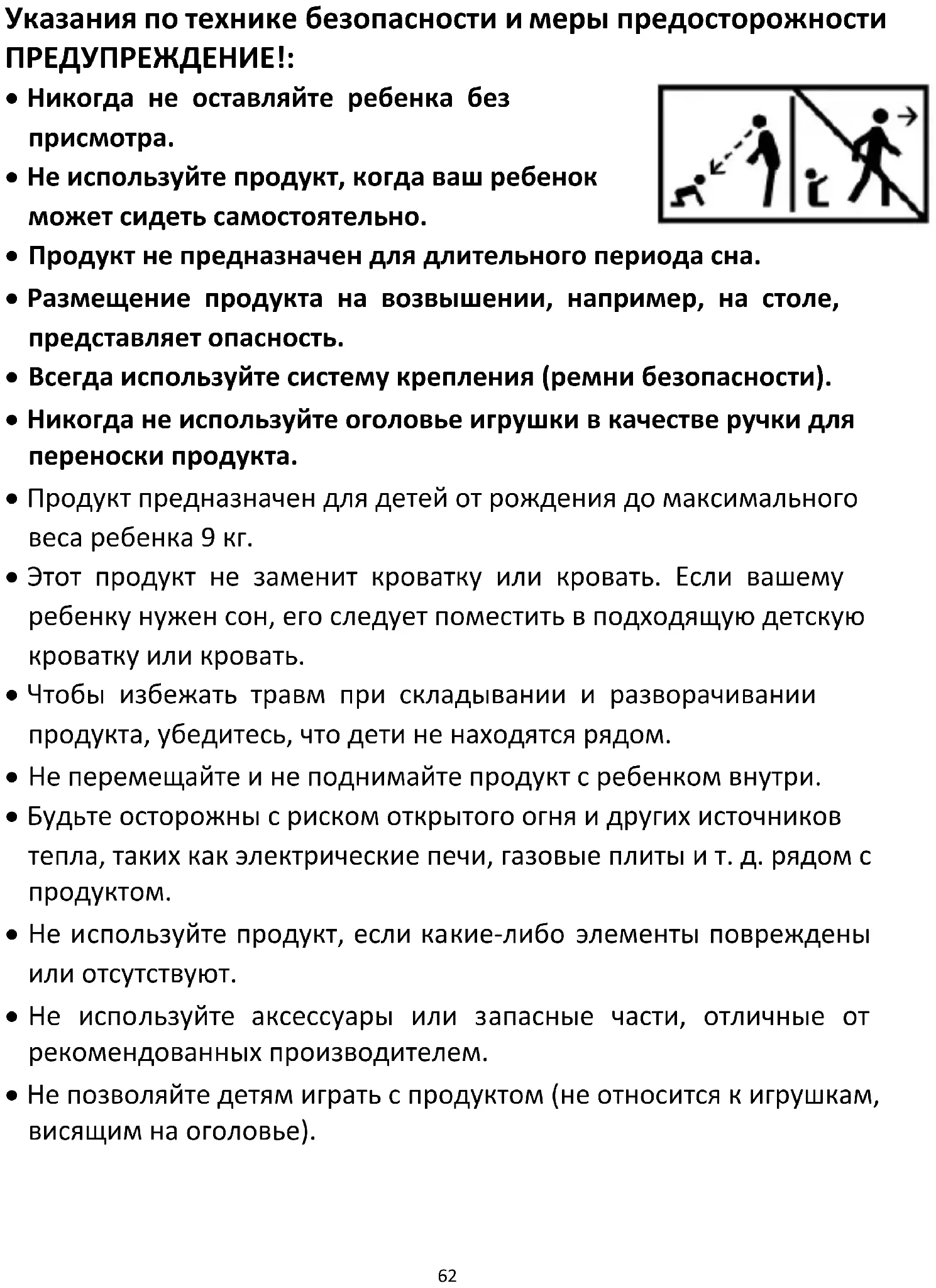 УВАЖАЕМЫЙ КЛИЕНТ! Благодарим Вас за покупку продукта Kinderkraft. Мы создаем с учетом вашего ребенка - мы всегда заботимся о безопасности и качестве, тем самым обеспечивая комфорт наилучшего выбора. ВАЖНО! ПРОЧТИТЕ ВНИМАТЕЛЬНО И СОХРАНИТЕ НА БУДУЩЕЕ.62 Указания по технике безопасности и меры предосторожности ПРЕДУПРЕЖДЕНИЕ!: