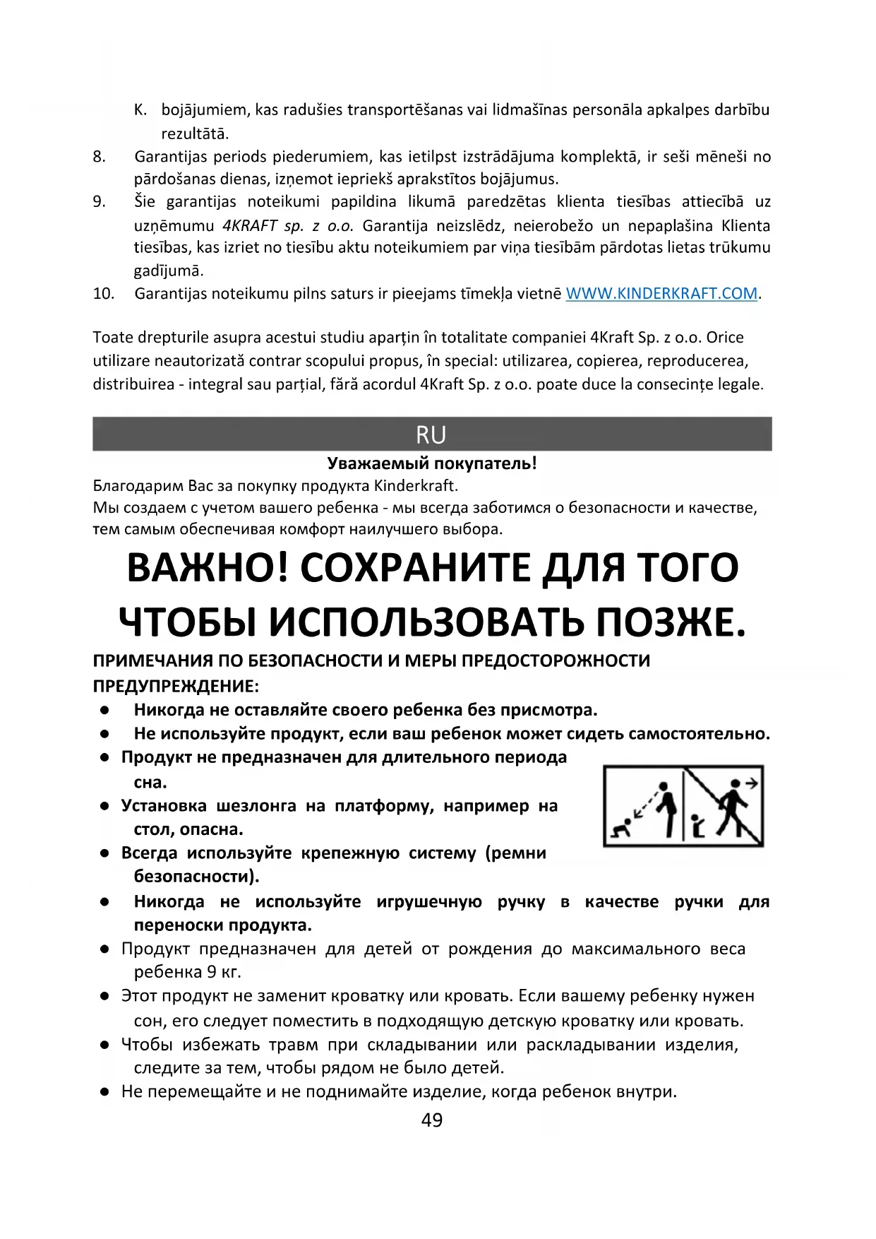 Уважаемый покупатель! Благодарим Вас за покупку продукта Kinderkraft. Мы создаем с учетом вашего ребенка - мы всегда заботимся о безопасности и качестве, тем самым обеспечивая комфорт наилучшего выбора. ВАЖНО! СОХРАНИТЕ ДЛЯ ТОГО ЧТОБЫ ИСПОЛЬЗОВАТЬ ПОЗЖЕ. ПРИМЕЧАНИЯ ПО БЕЗОПАСНОСТИ И МЕРЫ ПРЕДОСТОРОЖНОСТИ ПРЕДУПРЕЖДЕНИЕ: ● Никогда не оставляйте своего ребенка без присмотра. ● Не используйте продукт, если ваш ребенок может сидеть самостоятельно. ● Продукт не предназначен для длительного периода
