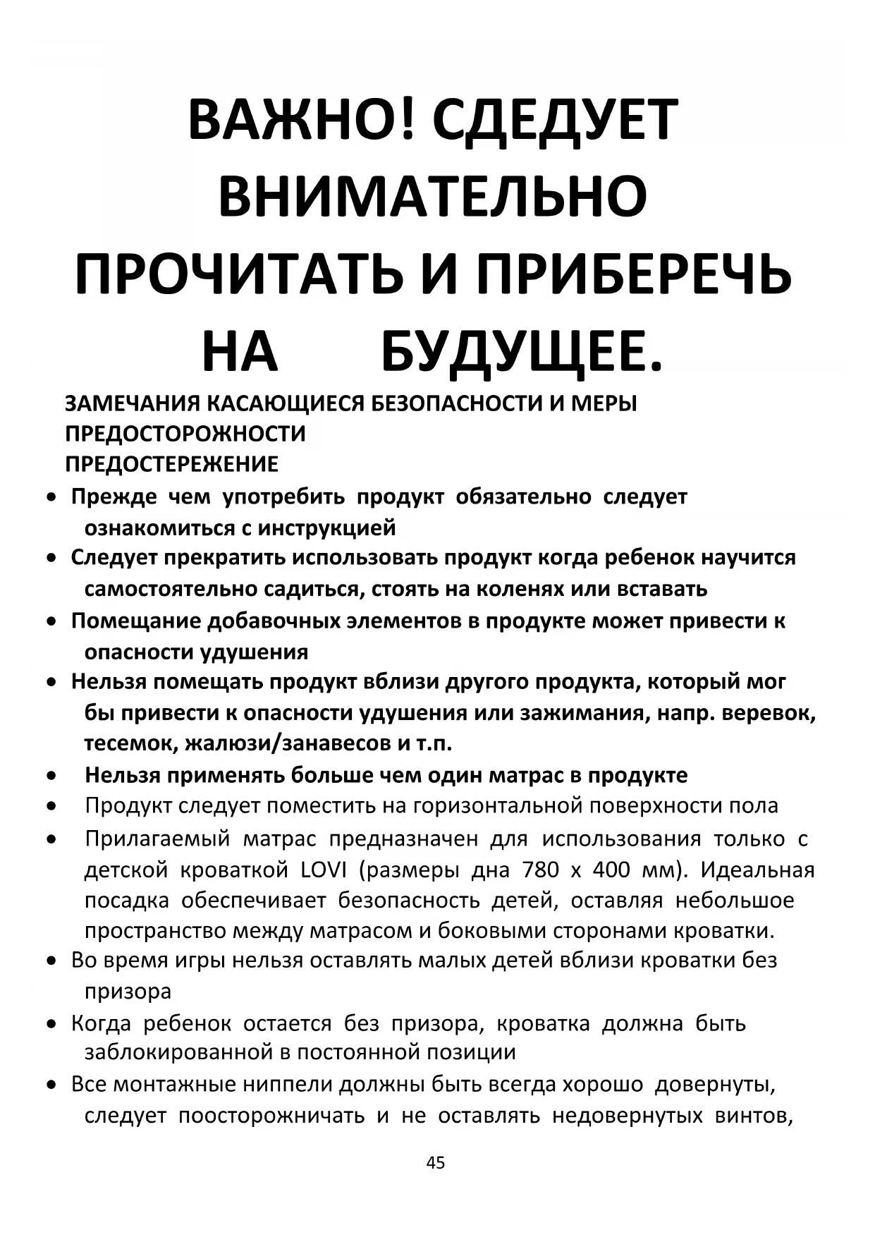 - НЕЛЬЗЯ употреблять кроватку, если не хватает какого-нибудь ее элемента или элементы эти повреждены или сломаны. В случае необходимости следует связаться с производителем запасных деталей или воспользоваться инструкцией. Нельзя заменять детали другими элементами.