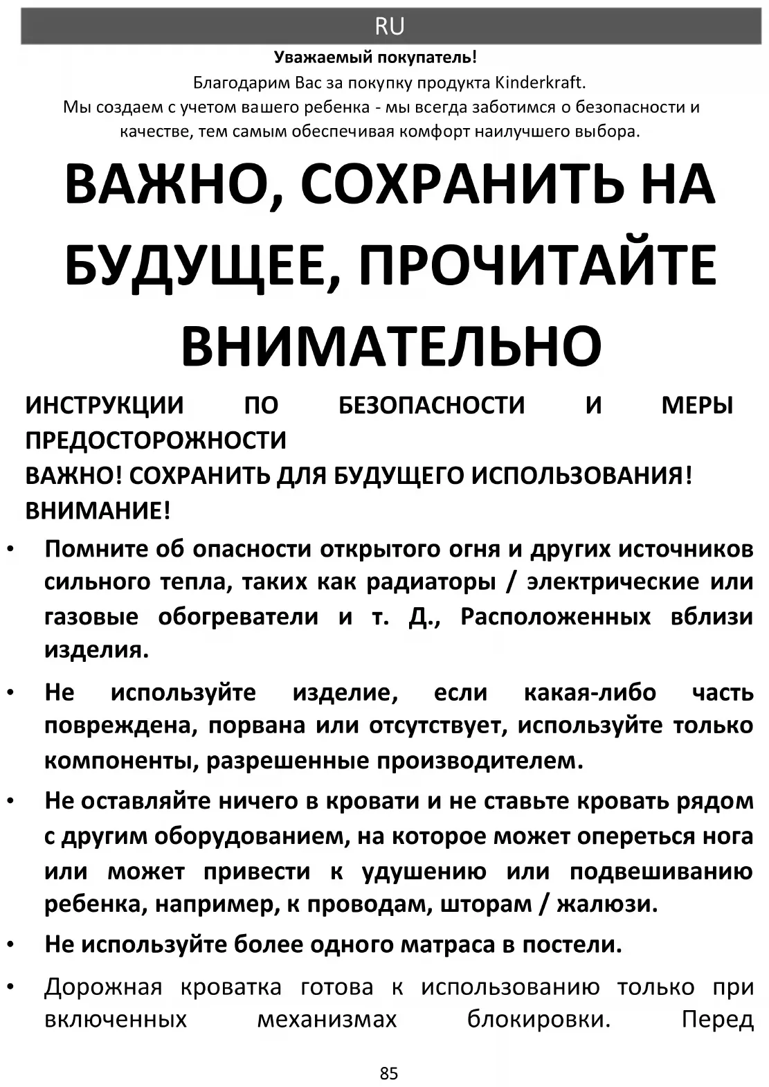 Уважаемый покупатель! Благодарим Вас за покупку продукта Kinderkraft. Мы создаем с учетом вашего ребенка - мы всегда заботимся о безопасности и качестве, тем самым обеспечивая комфорт наилучшего выбора. ВАЖНО, СОХРАНИТЬ НА БУДУЩЕЕ, ПРОЧИТАЙТЕ ВНИМАТЕЛЬНО ИНСТРУКЦИИ ПО БЕЗОПАСНОСТИ И МЕРЫ ПРЕДОСТОРОЖНОСТИ ВАЖНО! СОХРАНИТЬ ДЛЯ БУДУЩЕГО ИСПОЛЬЗОВАНИЯ!