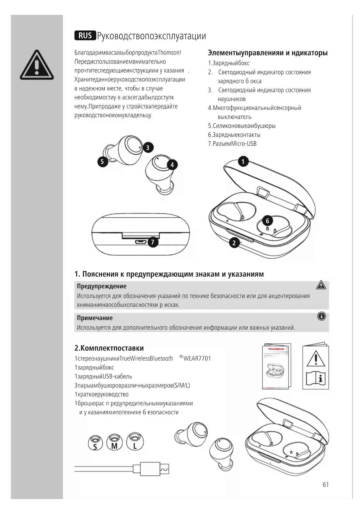 WEAR 7701 1 зарядный бокс 1 зарядный USB-кабель 3 пары амбушюров различных размеров (S/M/L) 1 краткое руководство 1 брошюра спредупредительными указаниями иуказаниями по техникебезопасности R Руководство по эксплуатации True Wireless HeadphonesÉcouteurs True Wireless БББББББББББ ББББББББ True WirelessWEAR7701