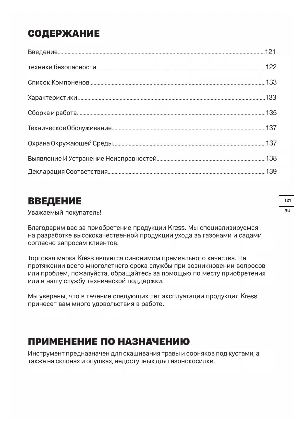 Уважаемый покупатель! Благодарим вас за приобретение продукции Kress. Мы специализируемся на разработке высококачественной продукции ухода за газонами и садами согласно запросам клиентов. Торговая марка Kress является синонимом премиального качества. На протяжении всего многолетнего срока службы при возникновении вопросов или проблем, пожалуйста, обращайтесь за помощью по месту приобретения или в нашу службу технической поддержки. Мы уверены, что в течение следующих лет эксплуатации продукция Kress принесет вам много удовольствия в работе. ПРИМЕНЕНИЕ ПО НАЗНАЧЕНИЮ Инструмент предназначен для скашивания травы и сорняков под кустами, а также на склонах и опушках, недоступных для газонокосилки.122
