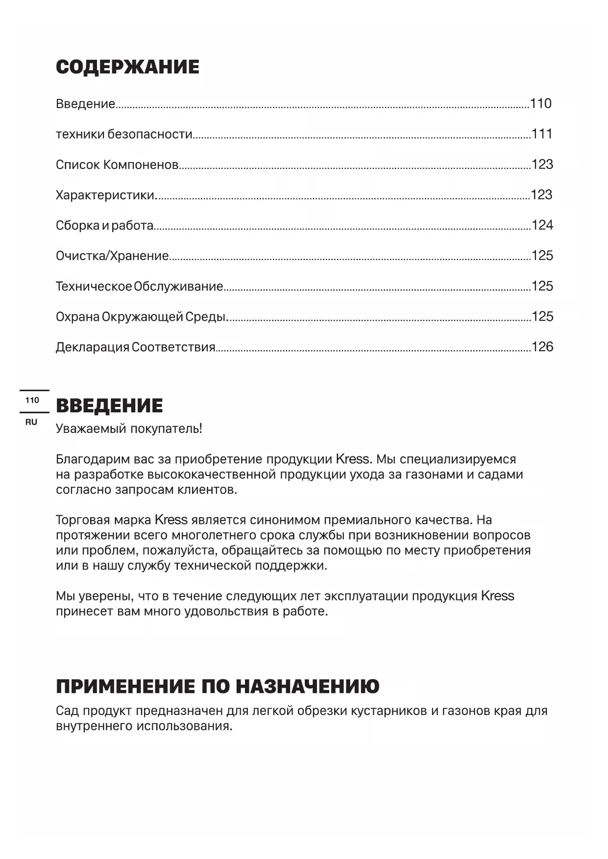 Уважаемый покупатель! Благодарим вас за приобретение продукции Kress. Мы специализируемся на разработке высококачественной продукции ухода за газонами и садами согласно запросам клиентов. Торговая марка Kress является синонимом премиального качества. На протяжении всего многолетнего срока службы при возникновении вопросов или проблем, пожалуйста, обращайтесь за помощью по месту приобретения или в нашу службу технической поддержки. Мы уверены, что в течение следующих лет эксплуатации продукция Kress принесет вам много удовольствия в работе. ПРИМЕНЕНИЕ ПО НАЗНАЧЕНИЮ Сад продукт предназначен для легкой обрезки кустарников и газонов края для внутреннего использования.111