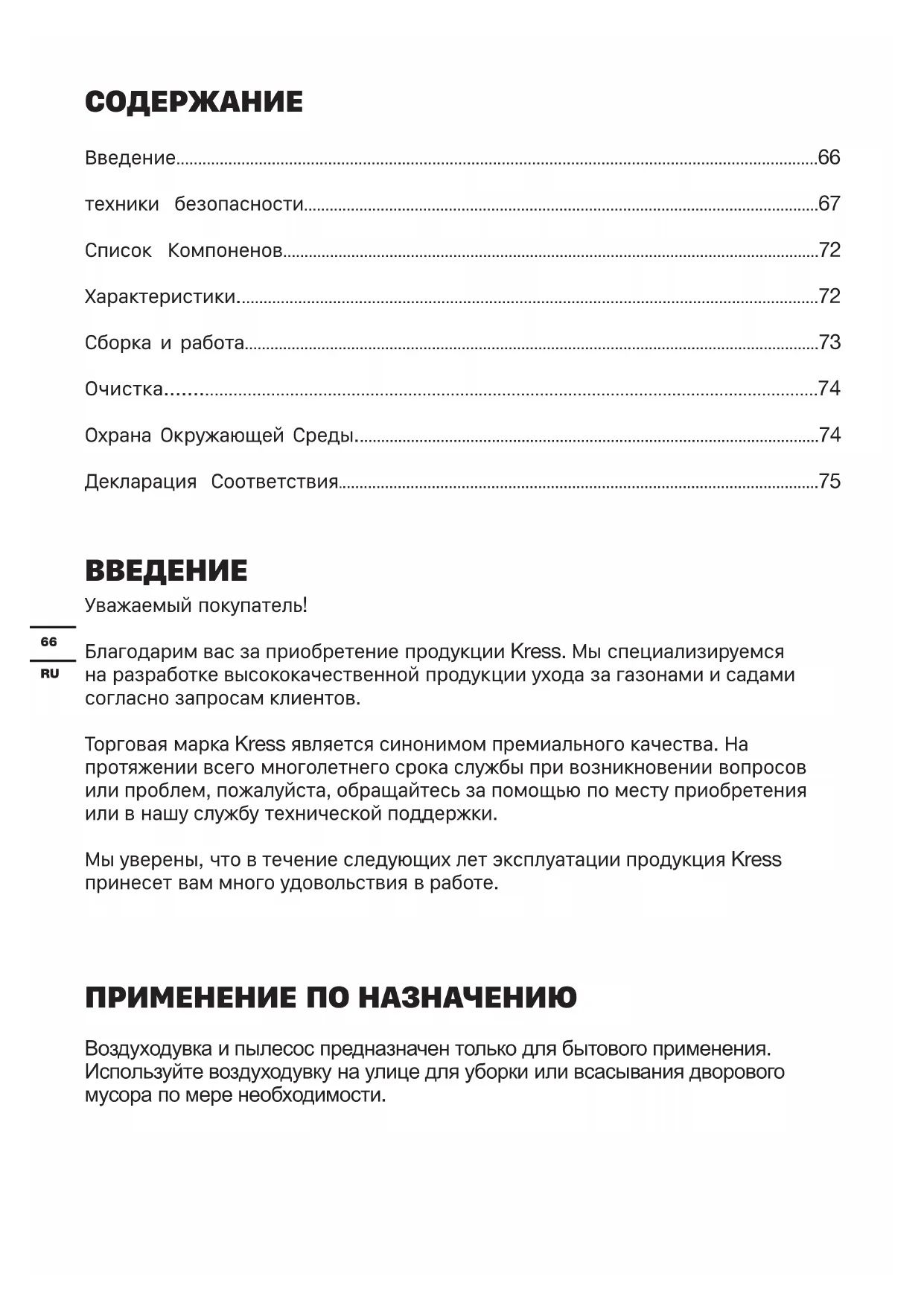 Уважаемый покупатель! Благодарим вас за приобретение продукции Kress. Мы специализируемся на разработке высококачественной продукции ухода за газонами и садами согласно запросам клиентов. Торговая марка Kress является синонимом премиального качества. На протяжении всего многолетнего срока службы при возникновении вопросов или проблем, пожалуйста, обращайтесь за помощью по месту приобретения или в нашу службу технической поддержки. Мы уверены, что в течение следующих лет эксплуатации продукция Kress принесет вам много удовольствия в работе. ПРИМЕНЕНИЕ ПО НАЗНАЧЕНИЮ Воздуходувка и пылесос предназначен только для бытового применения. Используйте воздуходувку на улице для уборки или всасывания дворового мусора по мере необходимости.67