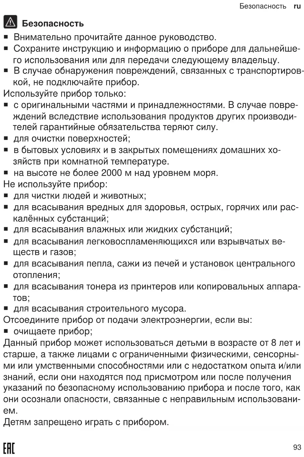 Безопасность ¡ Внимательно прочитайте данное руководство. ¡ Сохраните инструкцию и информацию о приборе для дальнейше- го использования или для передачи следующему владельцу. ¡ В случае обнаружения повреждений, связанных с транспортиров- кой, не подключайте прибор. Используйте прибор только: ¡ с оригинальными частями и принадлежностями. В случае повре- ждений вследствие использования продуктов других производи- телей гарантийные обязательства теряют силу. ¡ для очистки поверхностей; ¡ в бытовых условиях и в закрытых помещениях домашних хо- зяйств при комнатной температуре. ¡ на высоте не более 2000м над уровнем моря. Не используйте прибор: ¡ для чистки людей и животных; ¡ для всасывания вредных для здоровья, острых, горячих или рас- калённых субстанций; ¡ для всасывания влажных или жидких субстанций; ¡ для всасывания легковоспламеняющихся или взрывчатых ве- ществ и газов; ¡ для всасывания пепла, сажи из печей и установок центрального