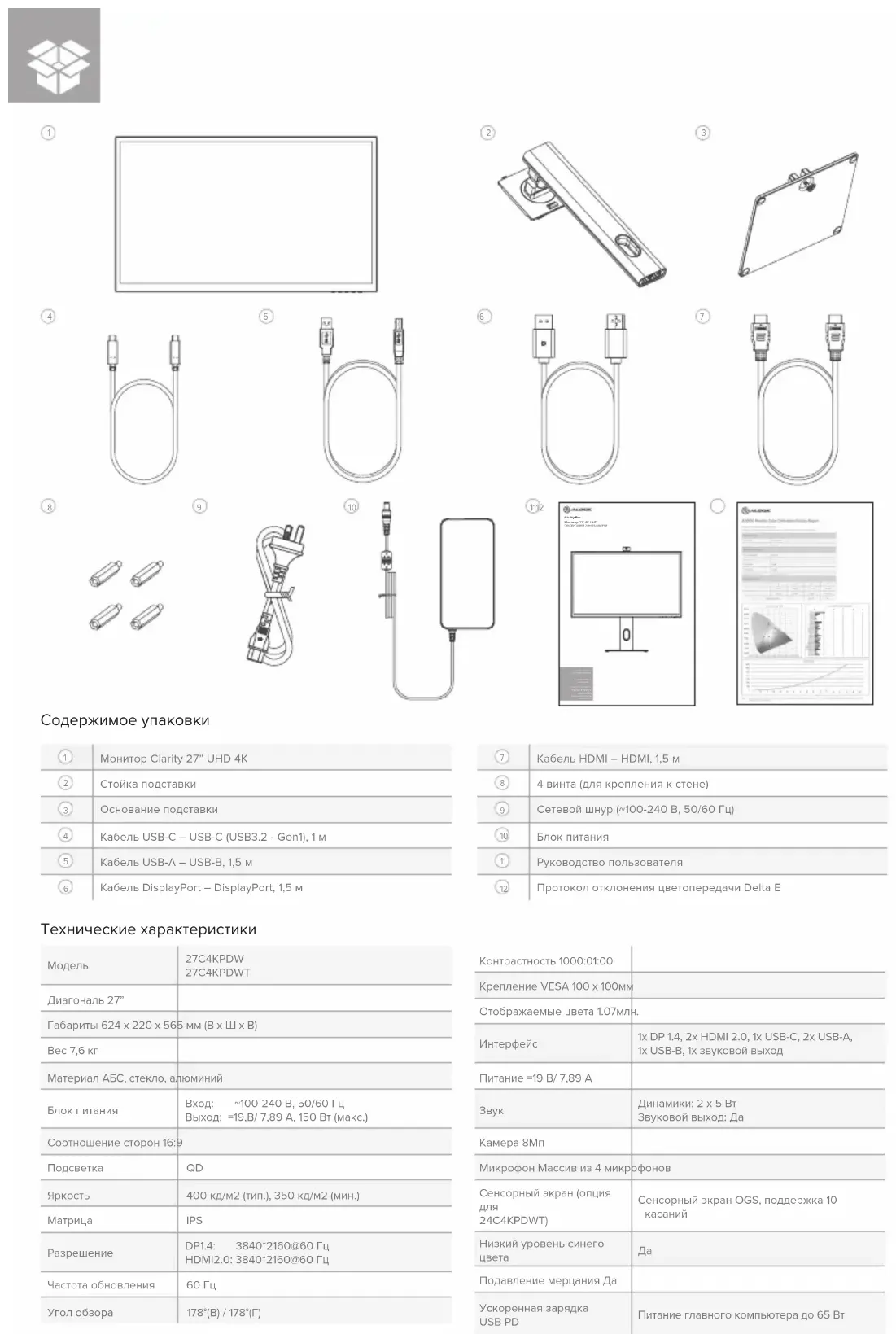 Содержимое упаковки Монитор Clarity 27” UHD 4K Стойка подставки Основание подставки Кабель USB-C – USB-C (USB3.2 - Gen1), 1 м Кабель USB-A – USB-B, 1,5 м Кабель DisplayPort – DisplayPort, 1,5 м Кабель HDMI – HDMI, 1,5 м 4 винта (для крепления к стене) Сетевой шнур (~100-240 В, 50/60 Гц) Блок питания Руководство пользователя Протокол отклонения цветопередачи Delta E