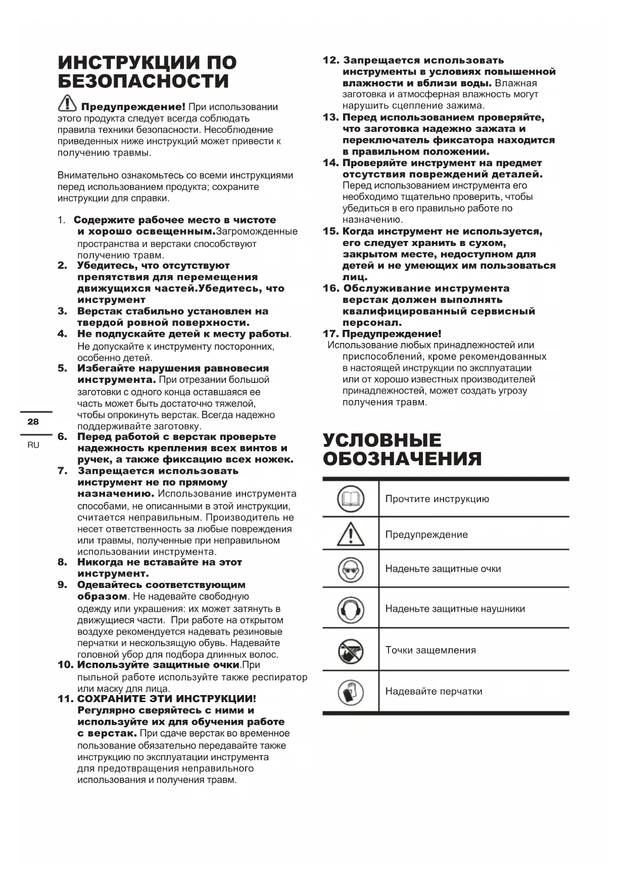 ОБОЗНАЧЕНИЯ Прочтите инструкцию Предупреждение Наденьте защитные очки Наденьте защитные наушники Точки защемления Надевайте перчатки29